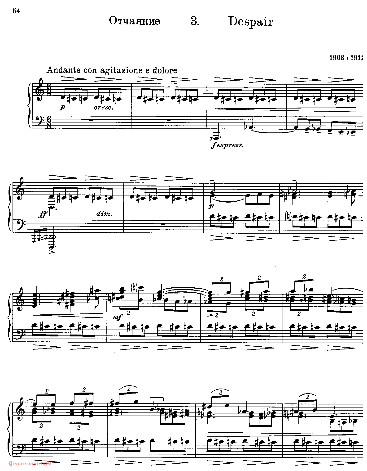 3. 绝望 Despair,忧伤而激动的行板,是四首小品中最有深度,篇幅最大者。全曲沉浸在深深的沮丧及迷惑的色彩中。