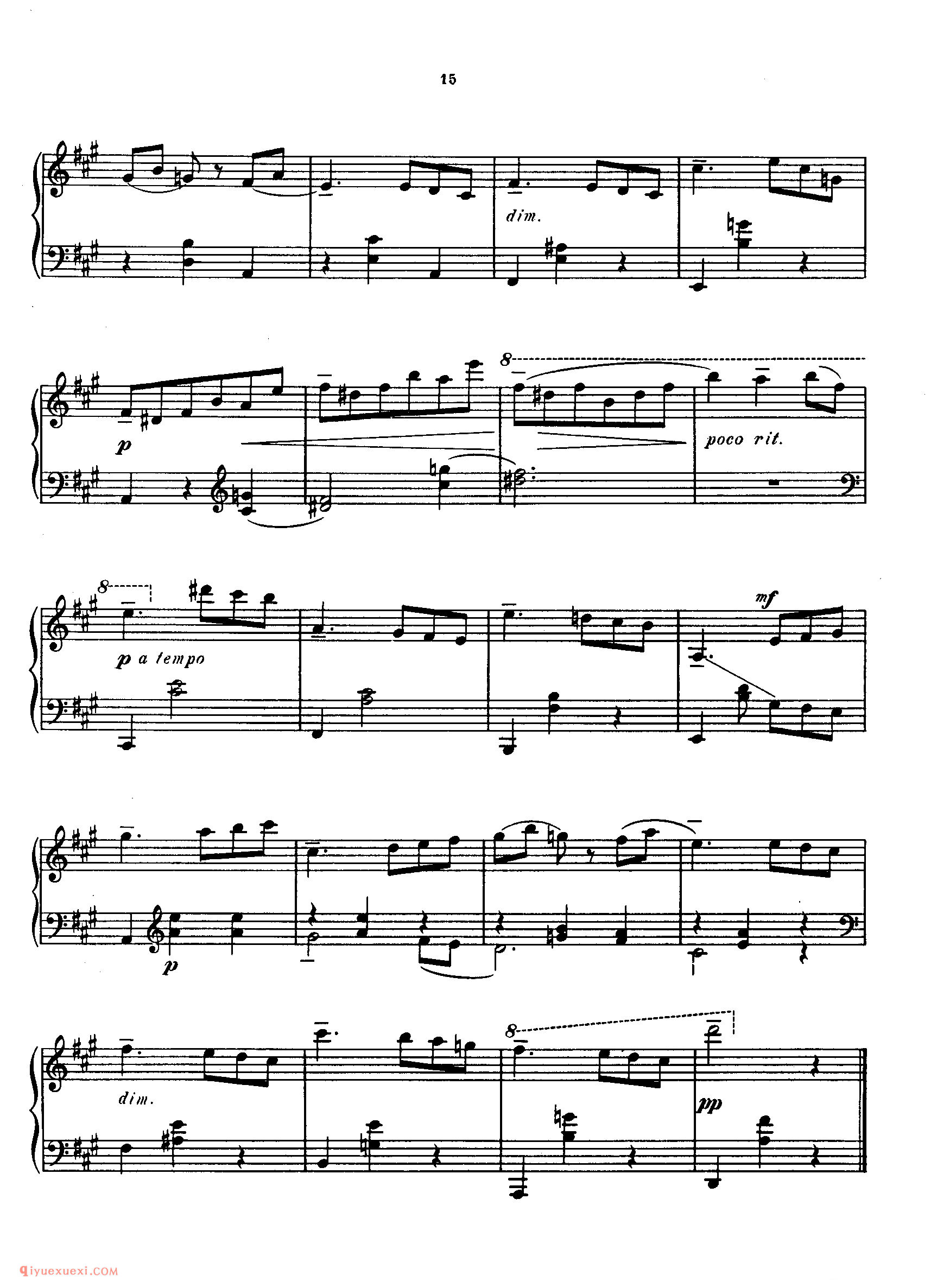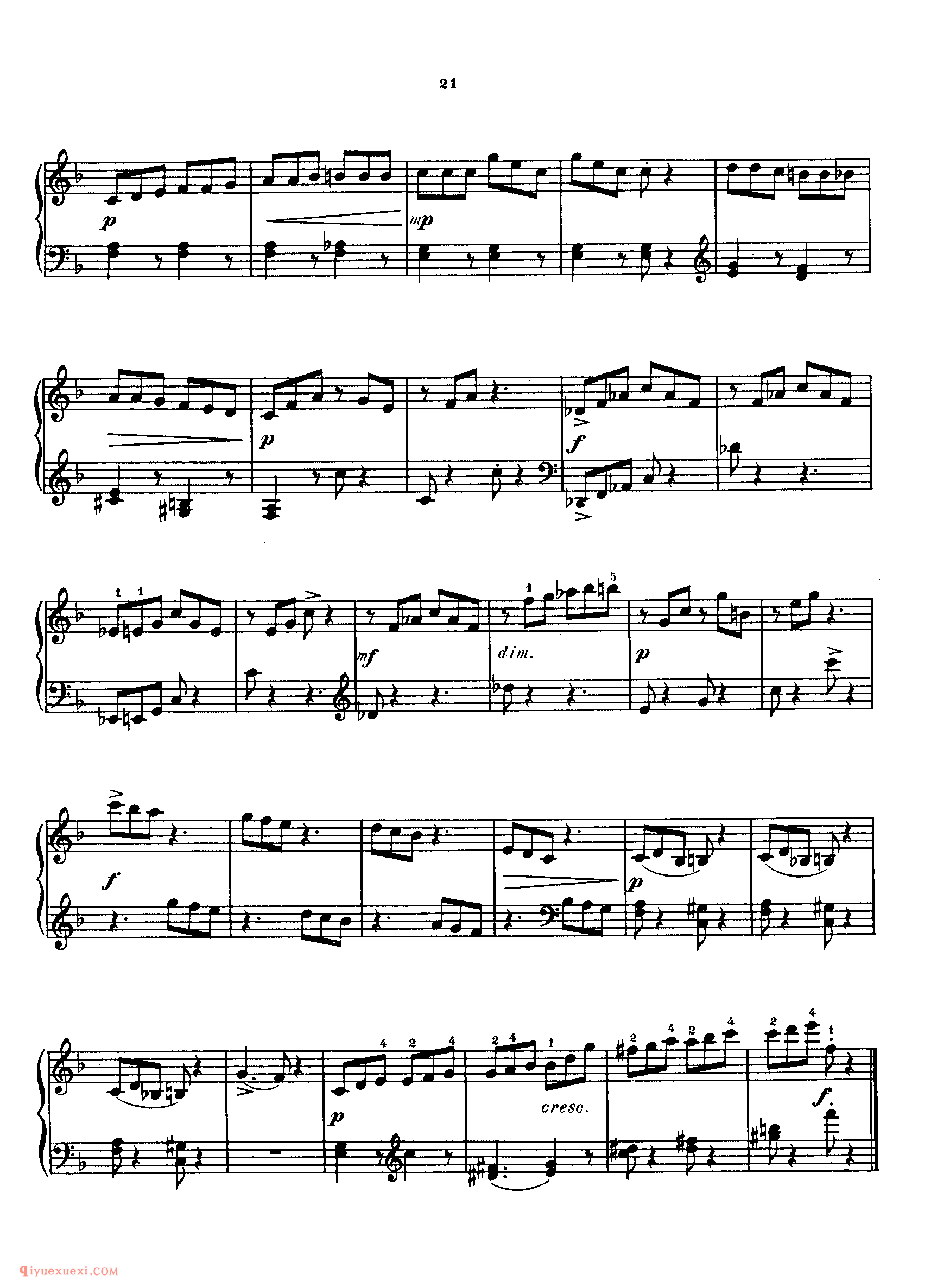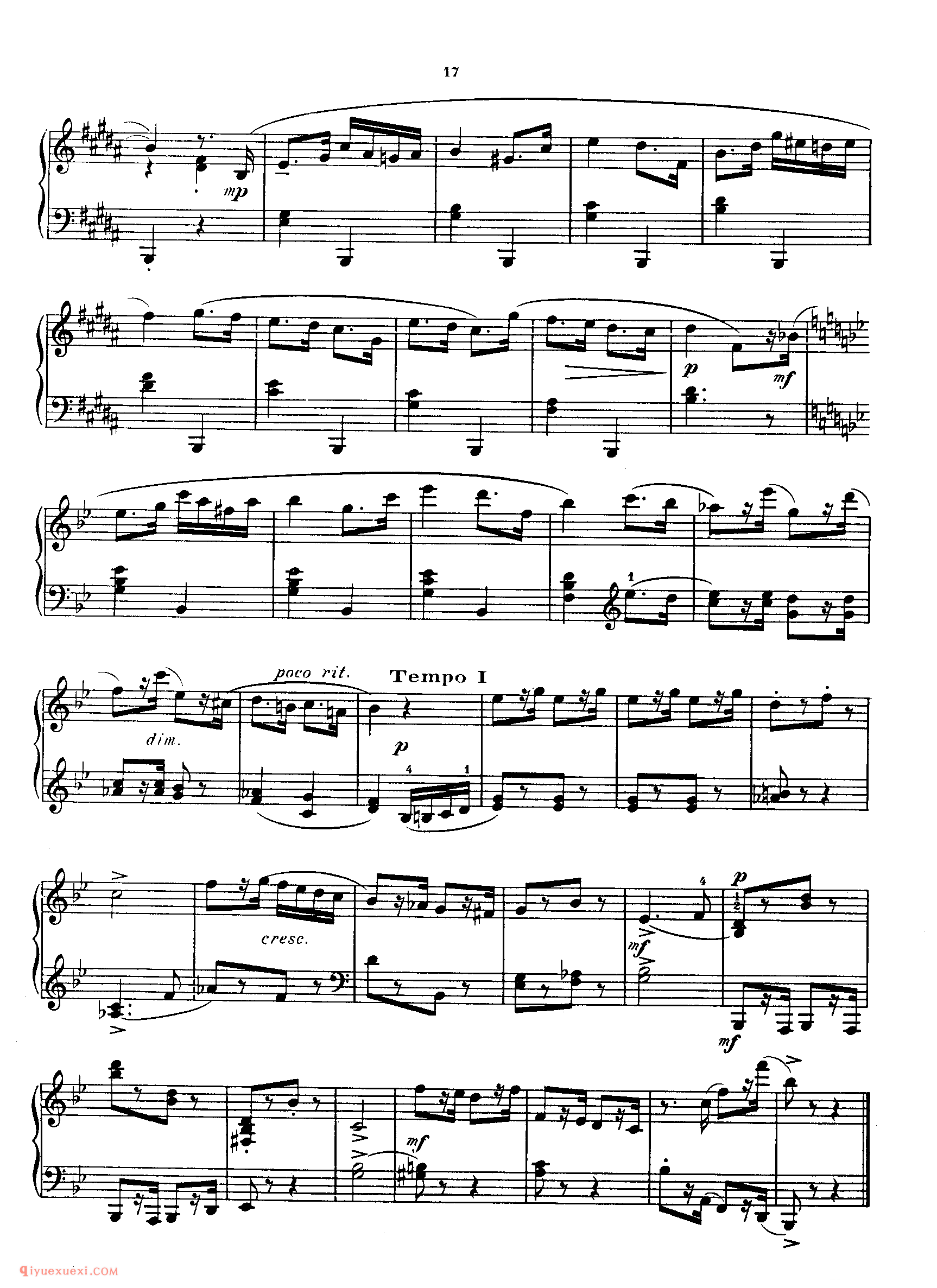 这首乐曲的左手弹奏时,小指既要站稳、保持,大指和三指又可略带轻微地带动手掌的翻动动作, 值得注意的是,19世纪的装饰音往往是在强拍之前弹奏的。因此第11小节的装饰音可从前一小节...