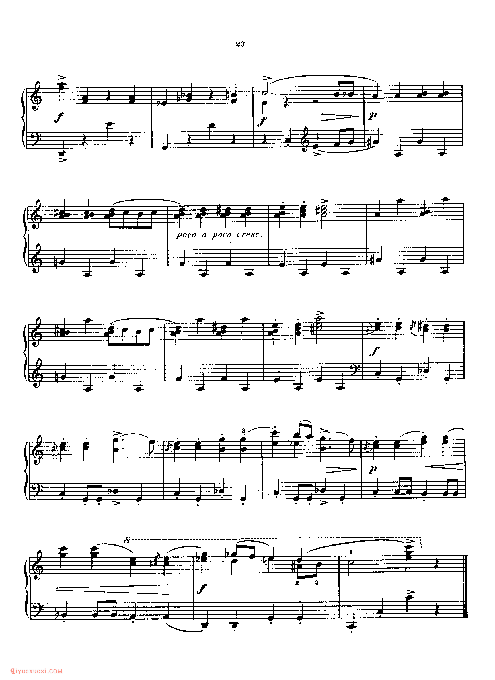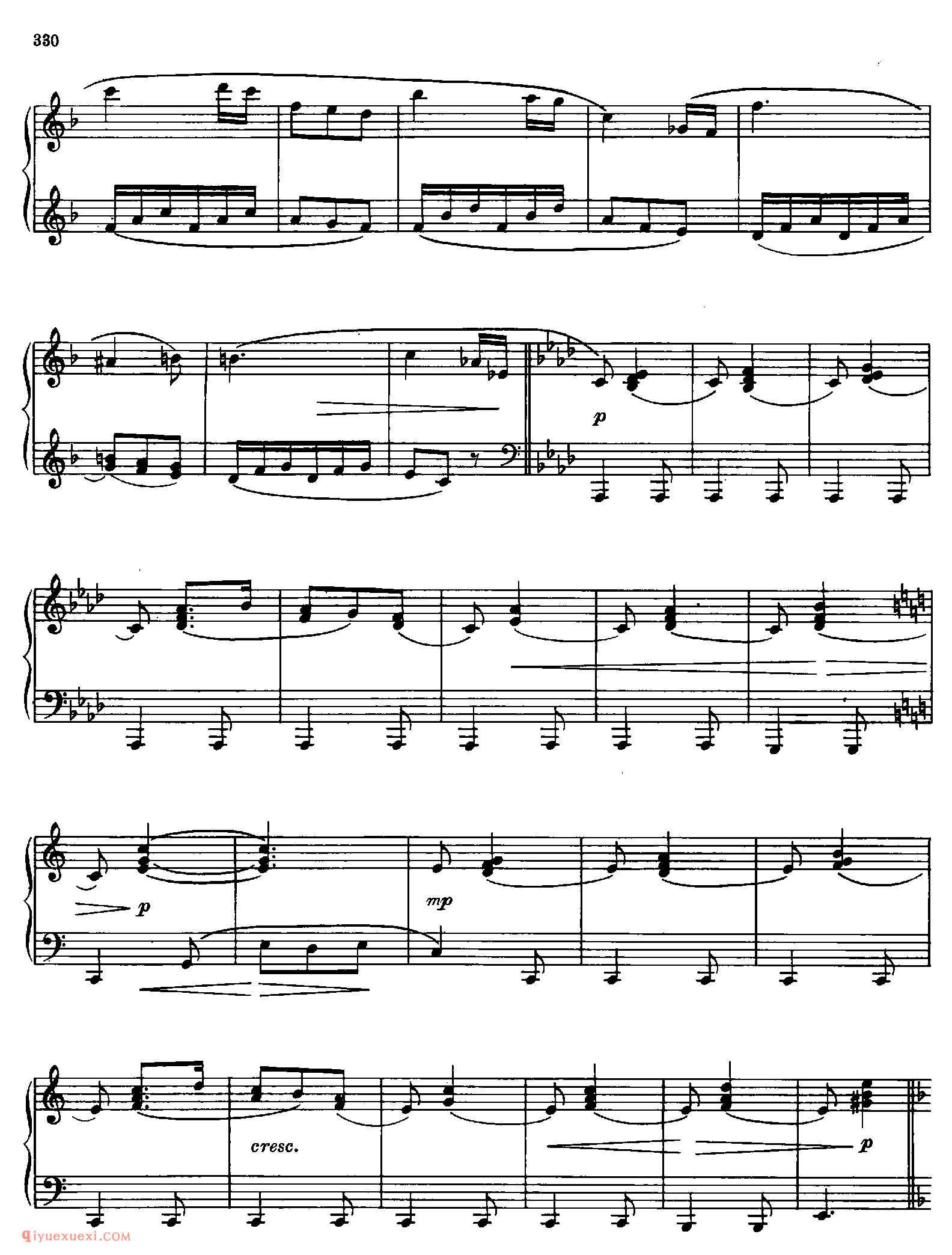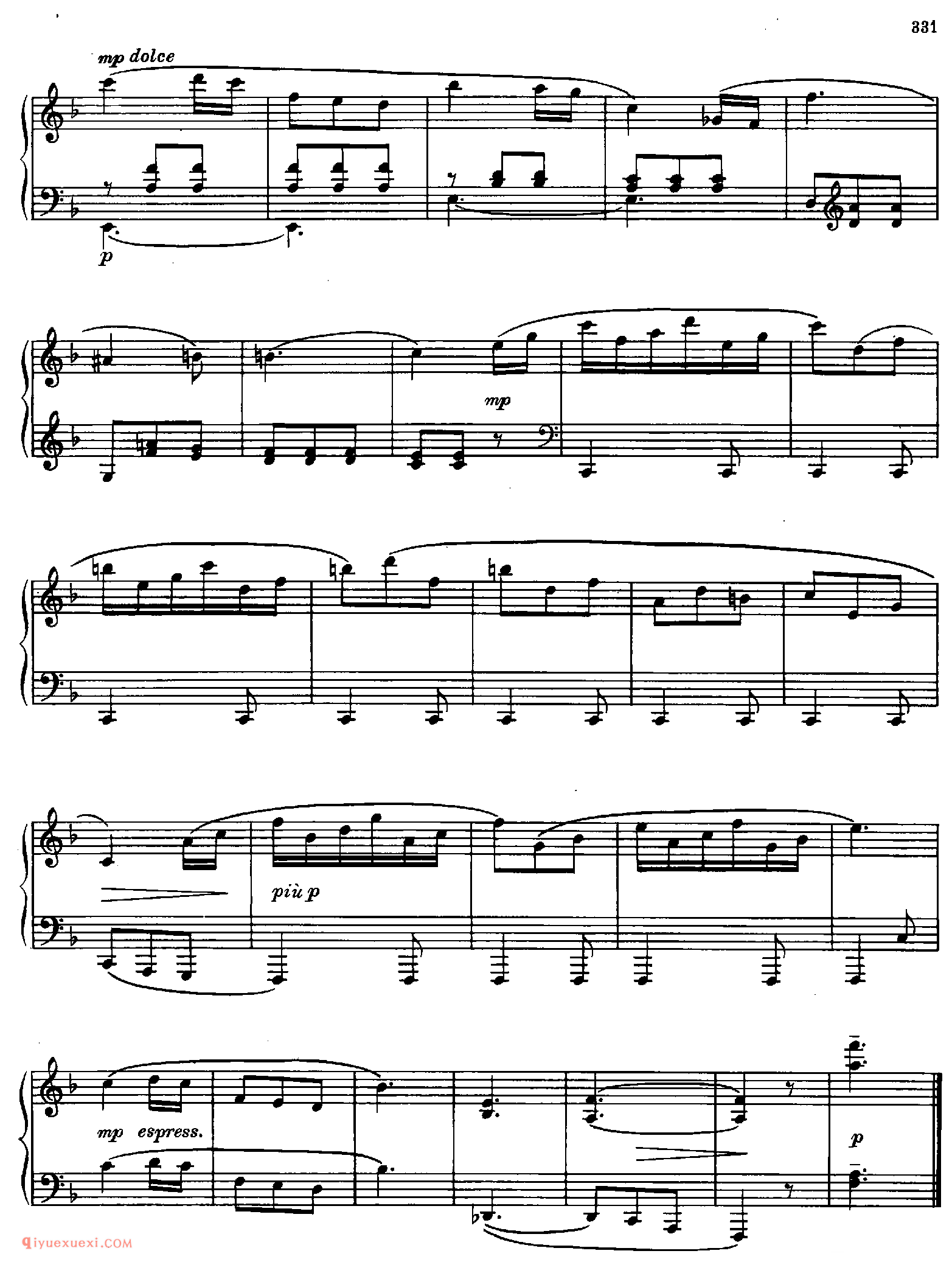 这首乐曲的左手弹奏时,小指既要站稳、保持,大指和三指又可略带轻微地带动手掌的翻动动作, 值得注意的是,19世纪的装饰音往往是在强拍之前弹奏的。因此第11小节的装饰音可从前一小节...