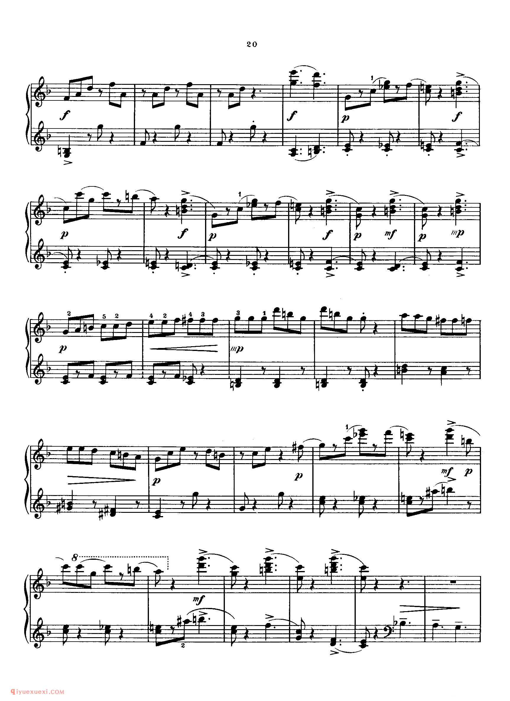 技巧: 1.这首作品和前面第八条的训练内容是一样的,都是音阶型的跑动练习,所不同的是这条练习曲以左手训练为主,左手需要注意的技巧要点和右手一样,仍然是换指动作的准确性。(具...