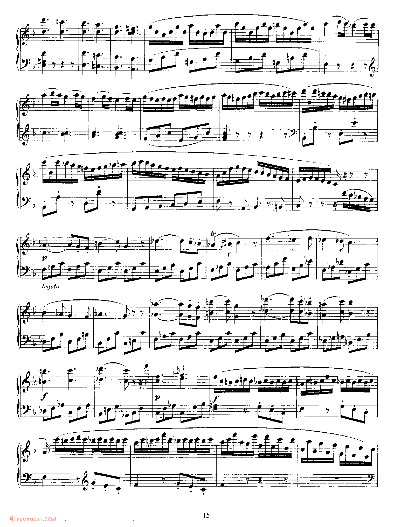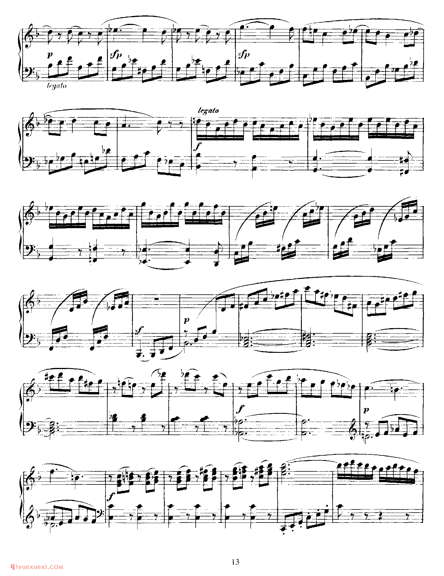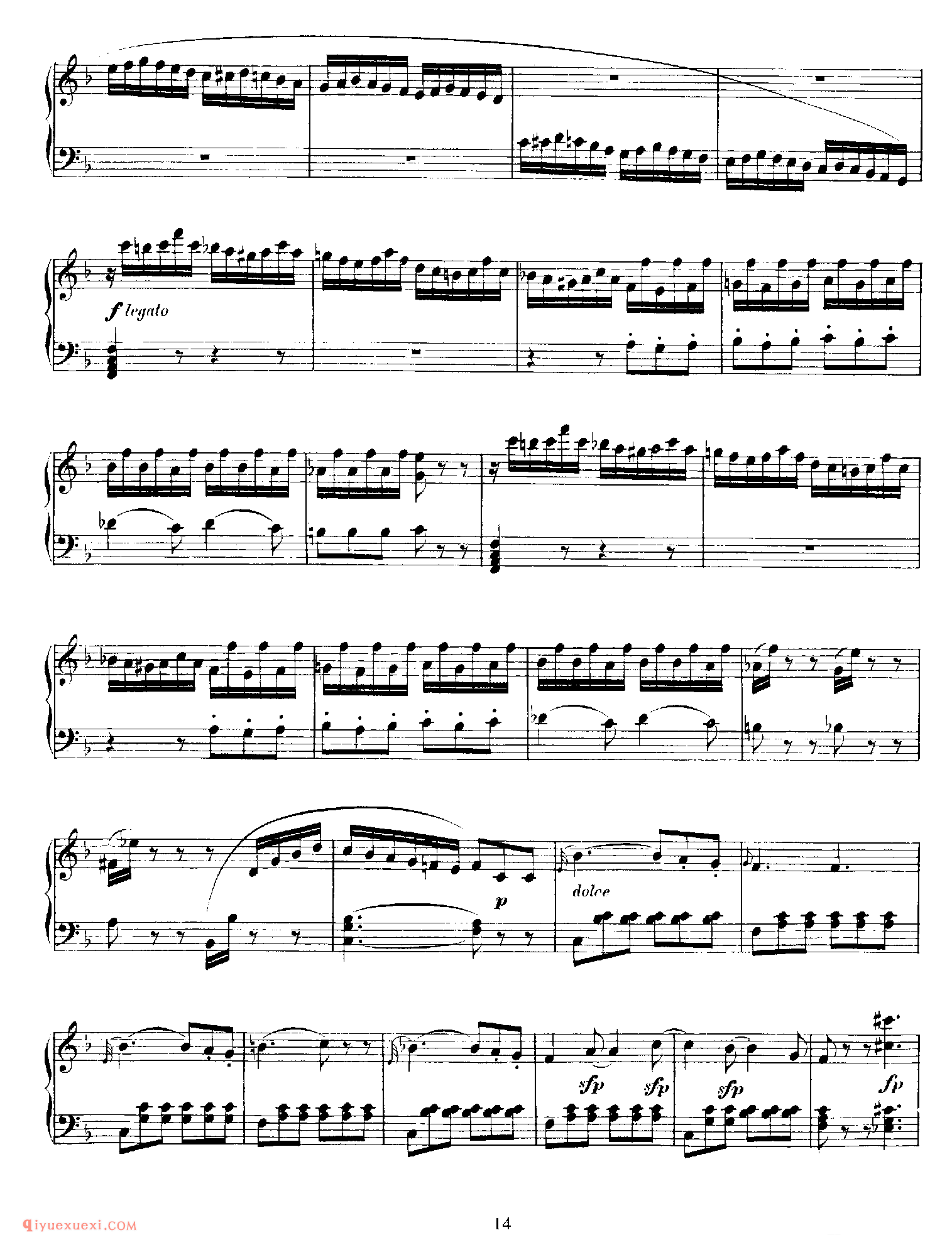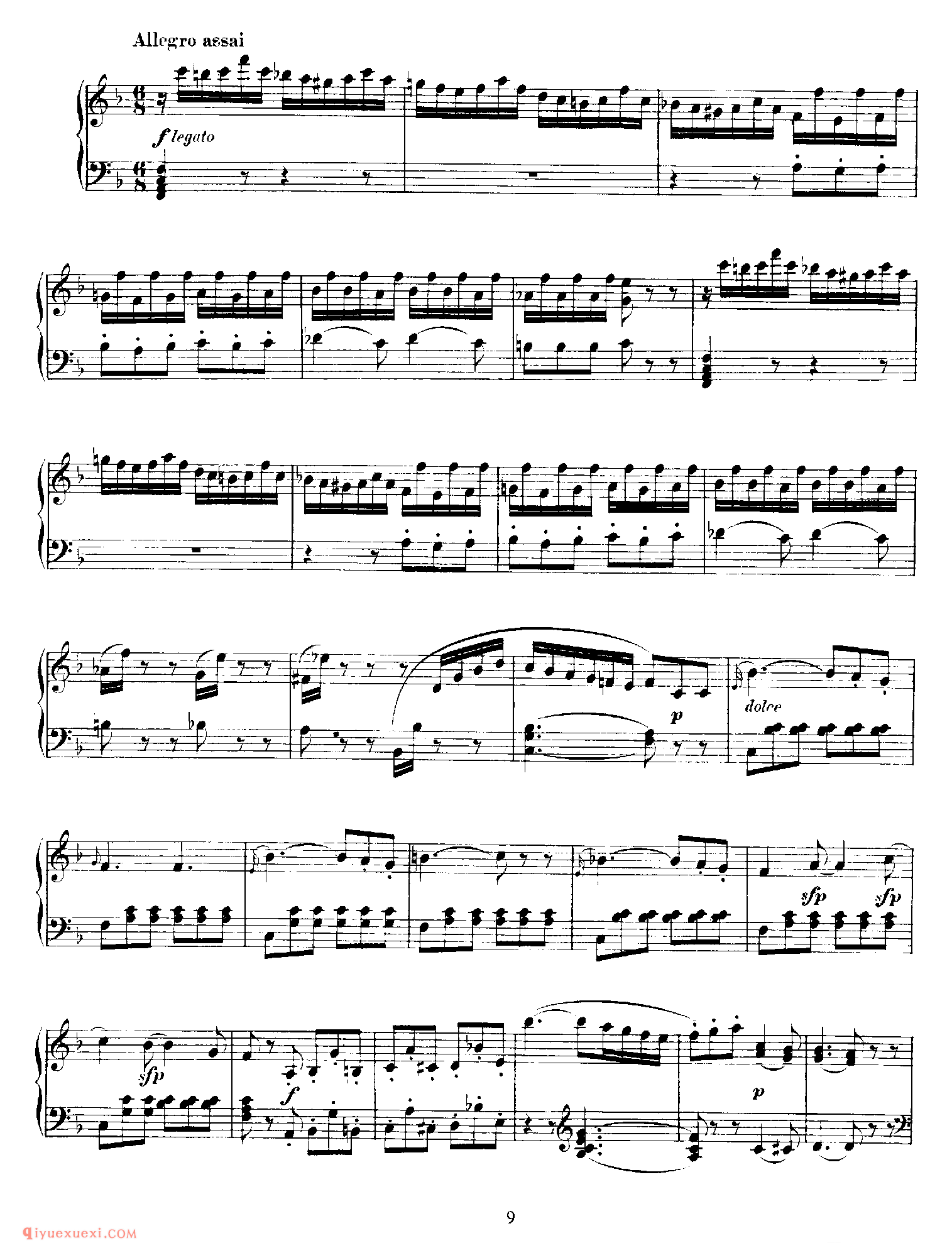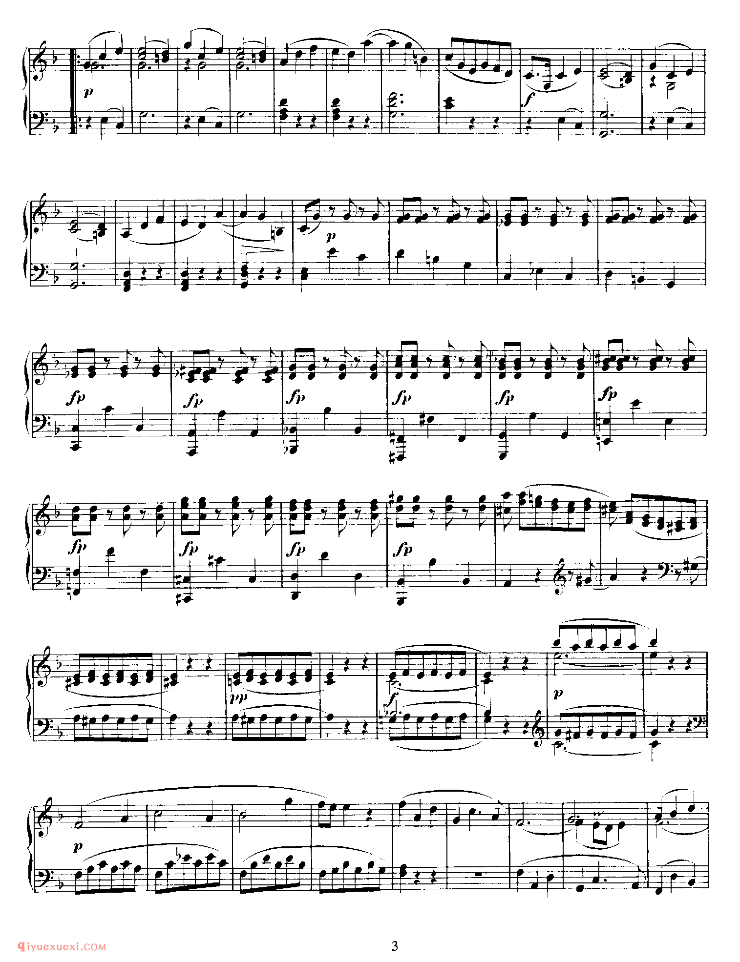 1.快板,F大调,奏鸣曲式。第一主题由主和弦分散和弦开始,经过句为D小调转至C小调的表情性乐段,在属调的第二主题后,以尾声作收束。发展部由转调音型开始,也使用第二主题后半部的音型。再现部除连接第一主题和第二主题的经过句被加强外,均按原型。