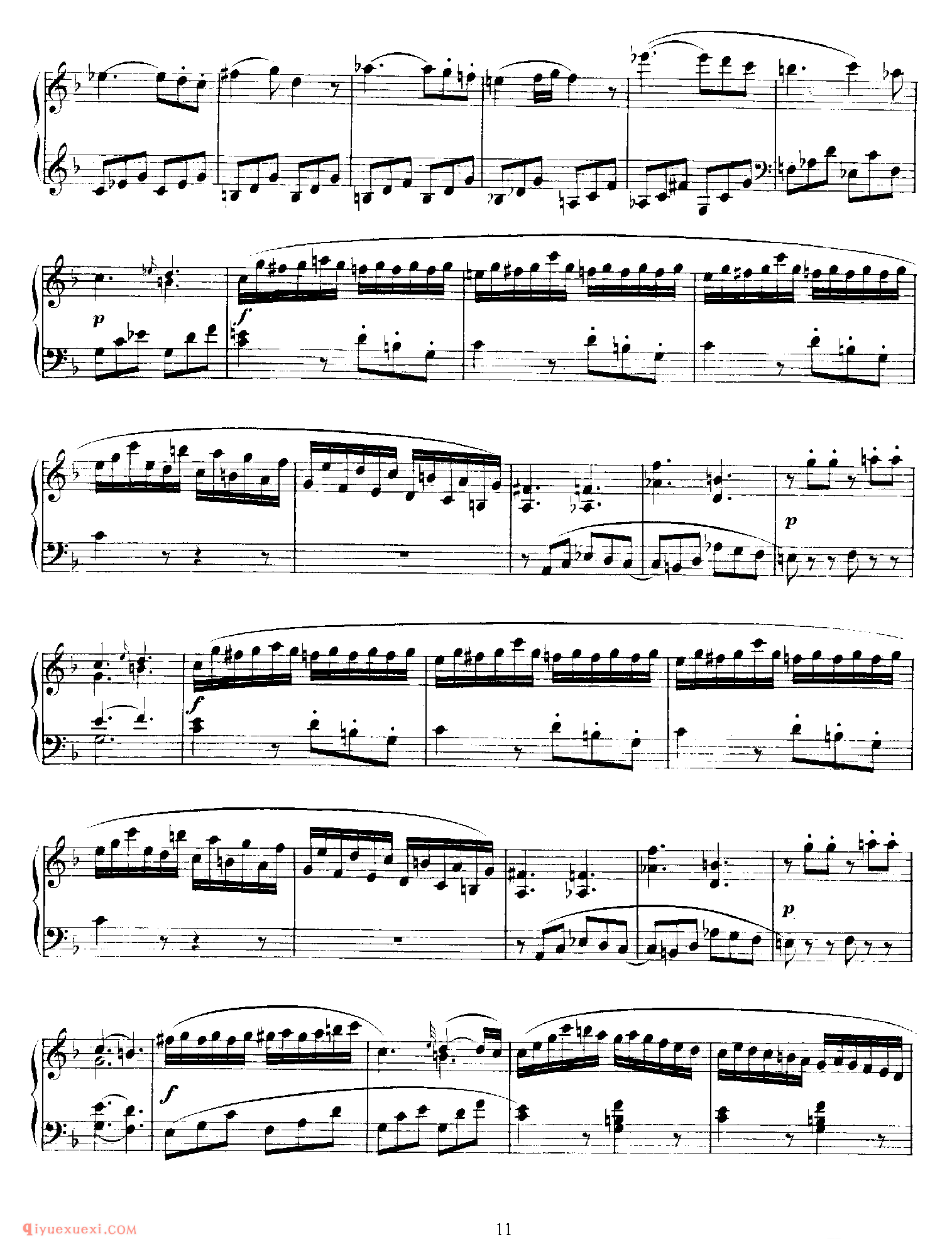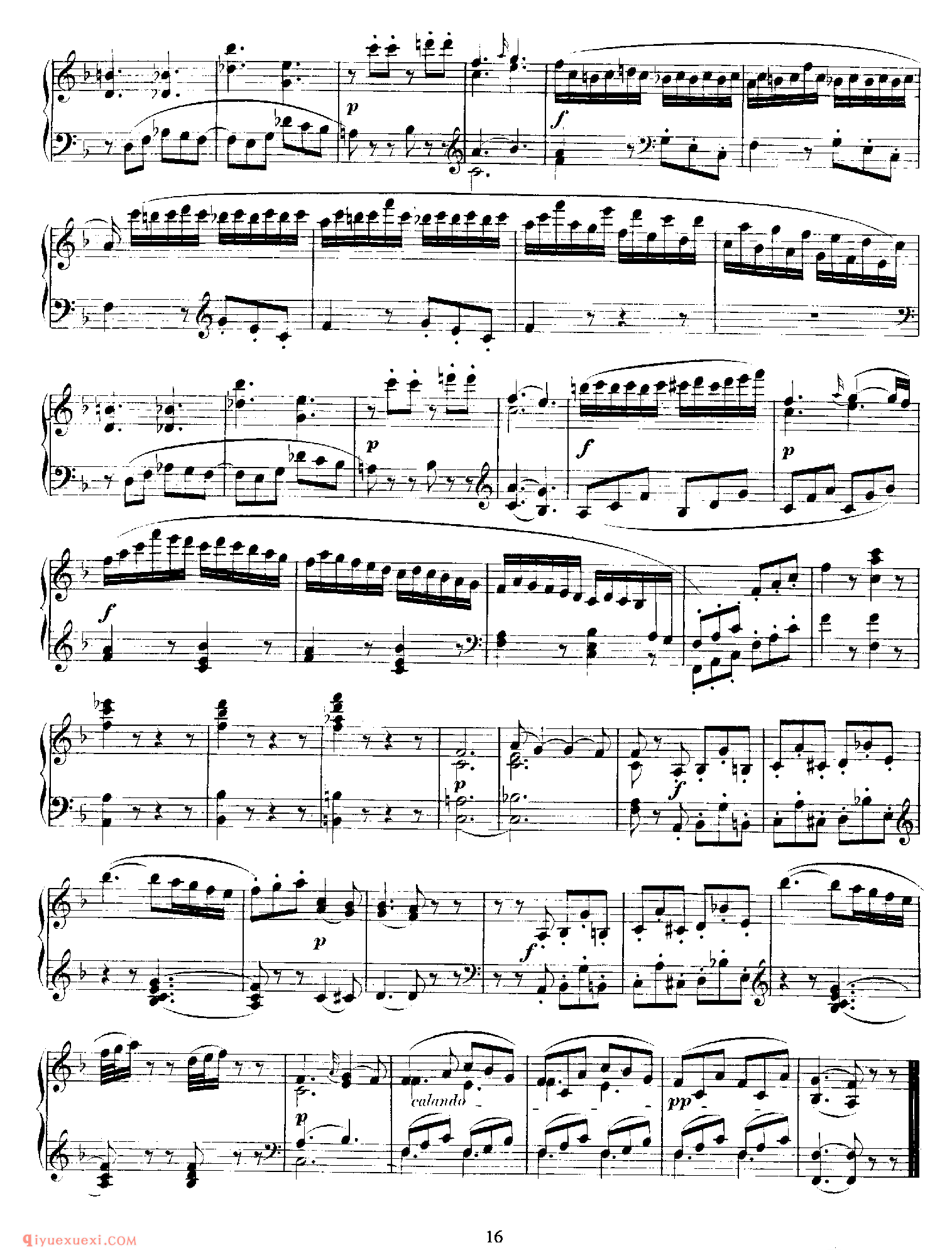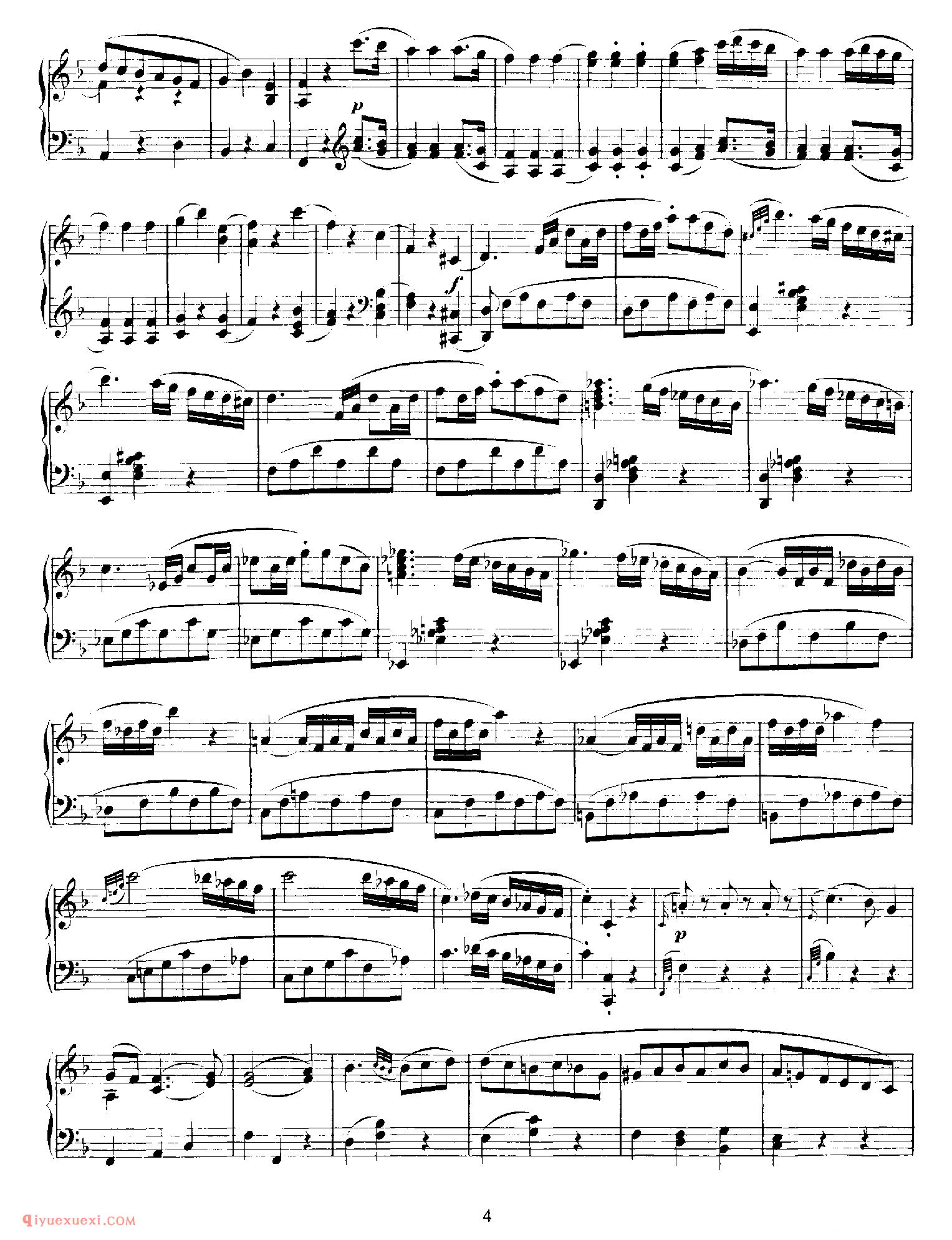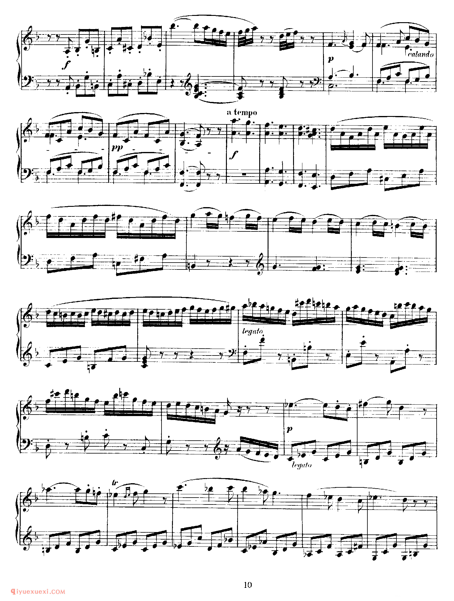 3.很快的快板,F大调,奏鸣曲式。第一主题是类似一段下降的华丽的快速音群,经经过句而进入第二主题部并以C大调对比性的音型作呈示部的收束。发展部以第一主题开始,再现部省略了第一主题部的最后一小段,夹着G小调的一段音群,第二主题以F小调再现,连接于F大调的音型,尾奏以渐慢的速度收束。