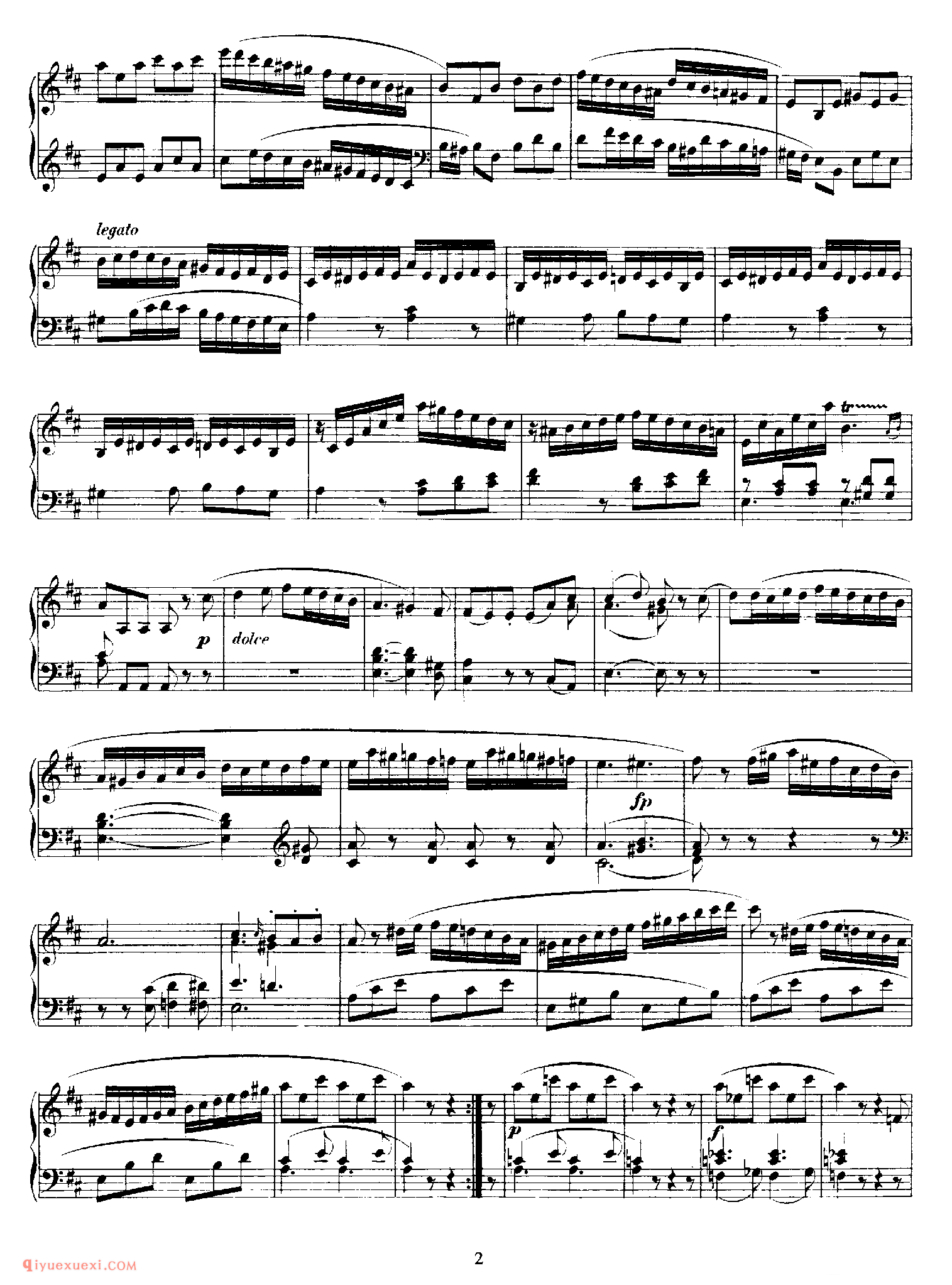 1.快板,D大调。奏鸣曲第一主题在主和弦分散和弦上开始,经过句由第一主题后半部发展而成,A大调第二主题也由第一主题引导而来。发展部由呈示部小尾奏的分散和弦开始,再以第一主题开头的分散和弦为材料构成对位。再现部再现第一主题后,再现第二主题,再再现经过句旋律。