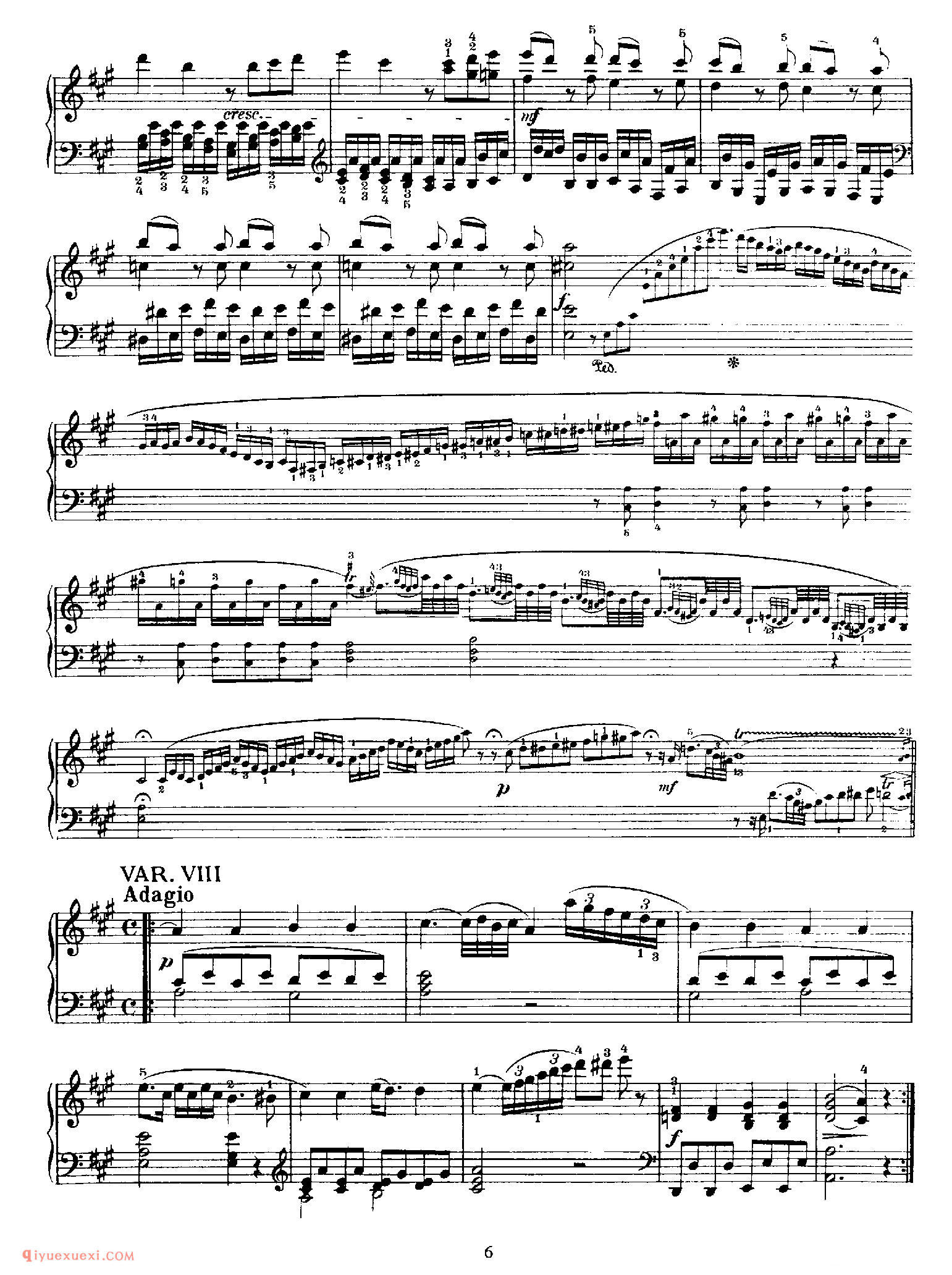 5.从1781-1791年在维也纳创作的6首:根据格雷特莱(Gretry)《撒姆尼人的婚礼》(Mariages Samnites)中的进行曲而作的8首变奏曲,K352/374C,作于1781年。根据帕伊谢(Paisiello)的《哲学随想》中的合唱《赞美你,我主》(Saive tu, Domine)而作的6首变奏曲,K398/416e,作于1783年。根据格鲁克的《麦加香客》(Pilgrimme von Mekka)中的《我们愚蠢小民认为》(Unser dummer Pobel meint)而作的10首变奏曲,K455,作于1784年。根据萨尔蒂(Sarti)中的《像羔羊一样》(Come un' agnello)而作的2首变奏曲,K460/454a,作于1784年。为降B大调小快板而作的12首变奏曲,K500,作于1786年。为沙克 (Schack)的《女人是最美妙的事物》(Ein Weib ist das herrlichste Ding)而作的8首变奏曲,K613,作于1791年。