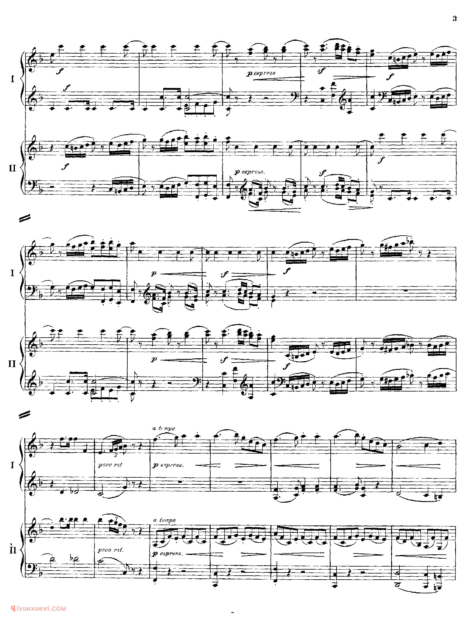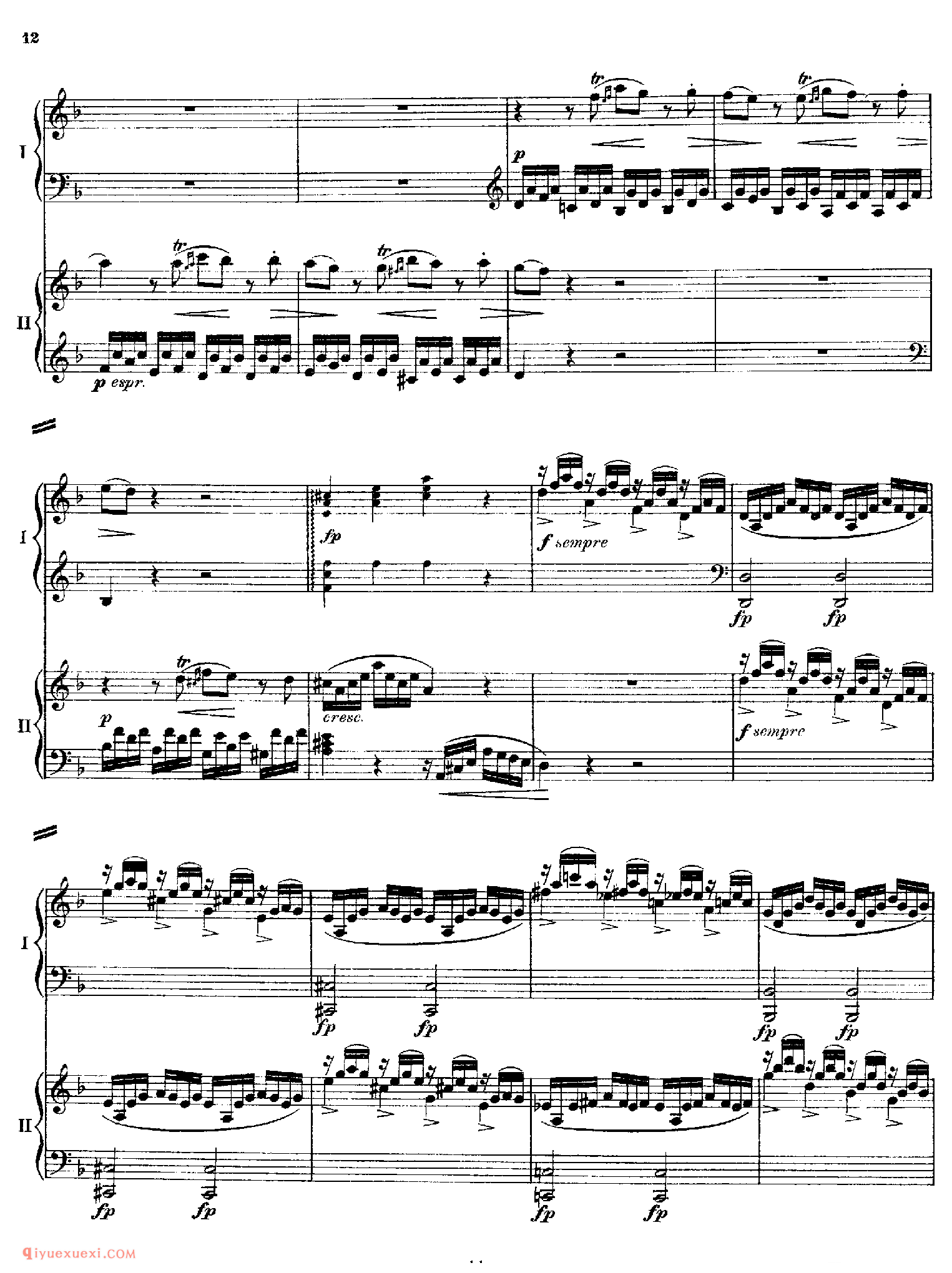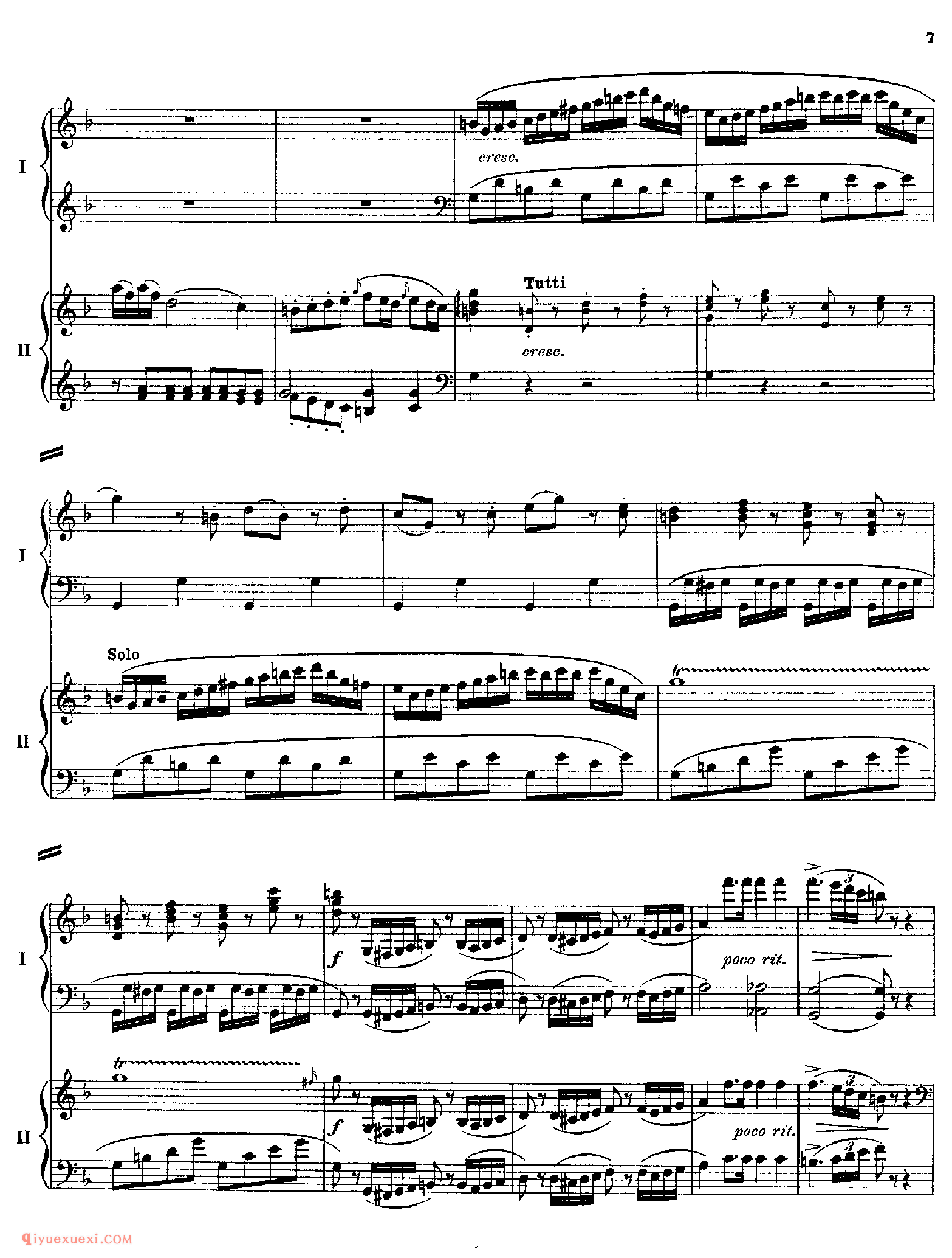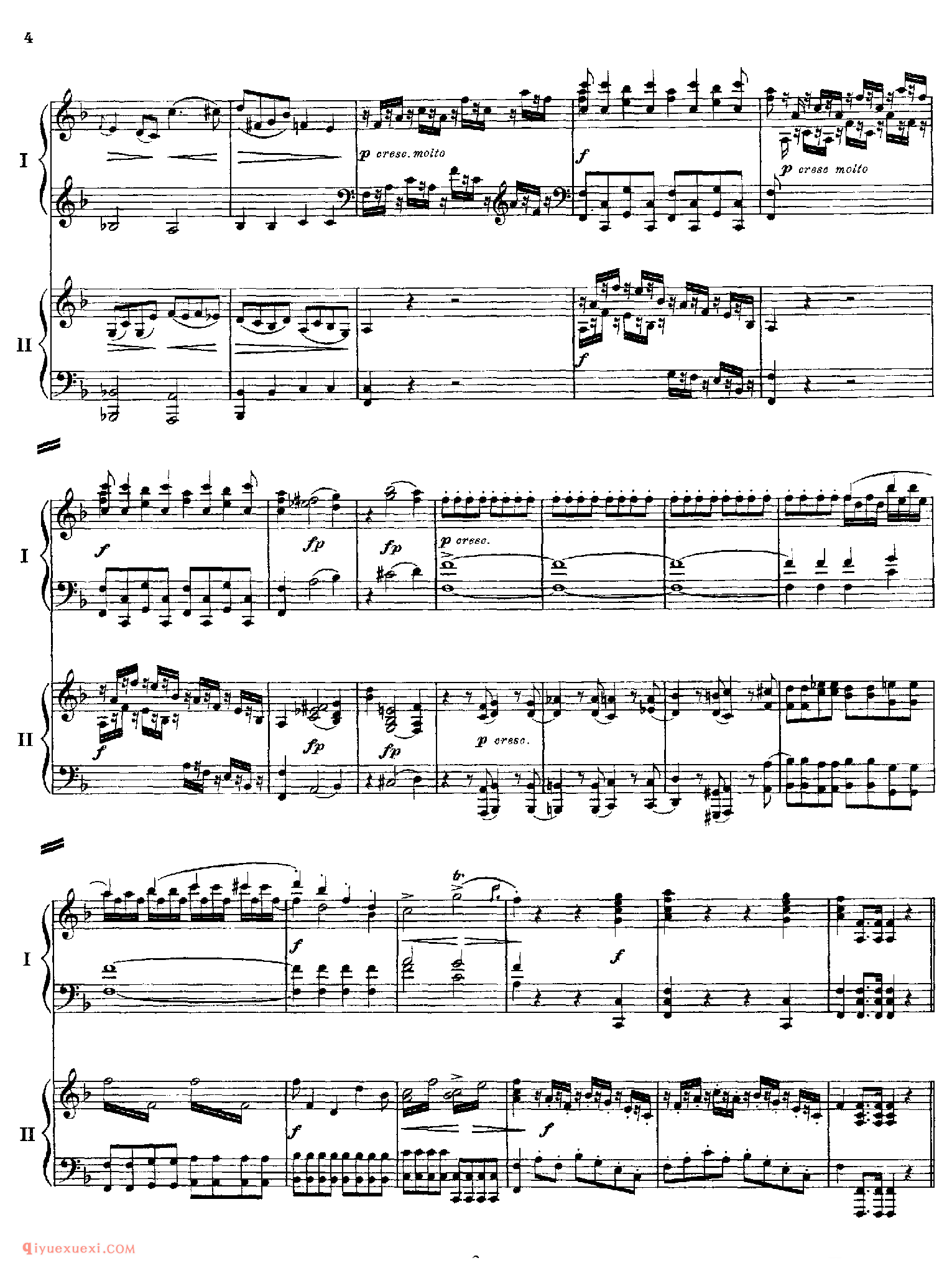 3.小步舞曲,F大调,A-B-A-C-A-B-A的大回旋曲式。小步舞曲性格的第一主题先由第一钢琴呈示,B段为c大调,C段为C小调,先由第二钢琴演奏。第三次上场的A段则插入降B大调新主题。