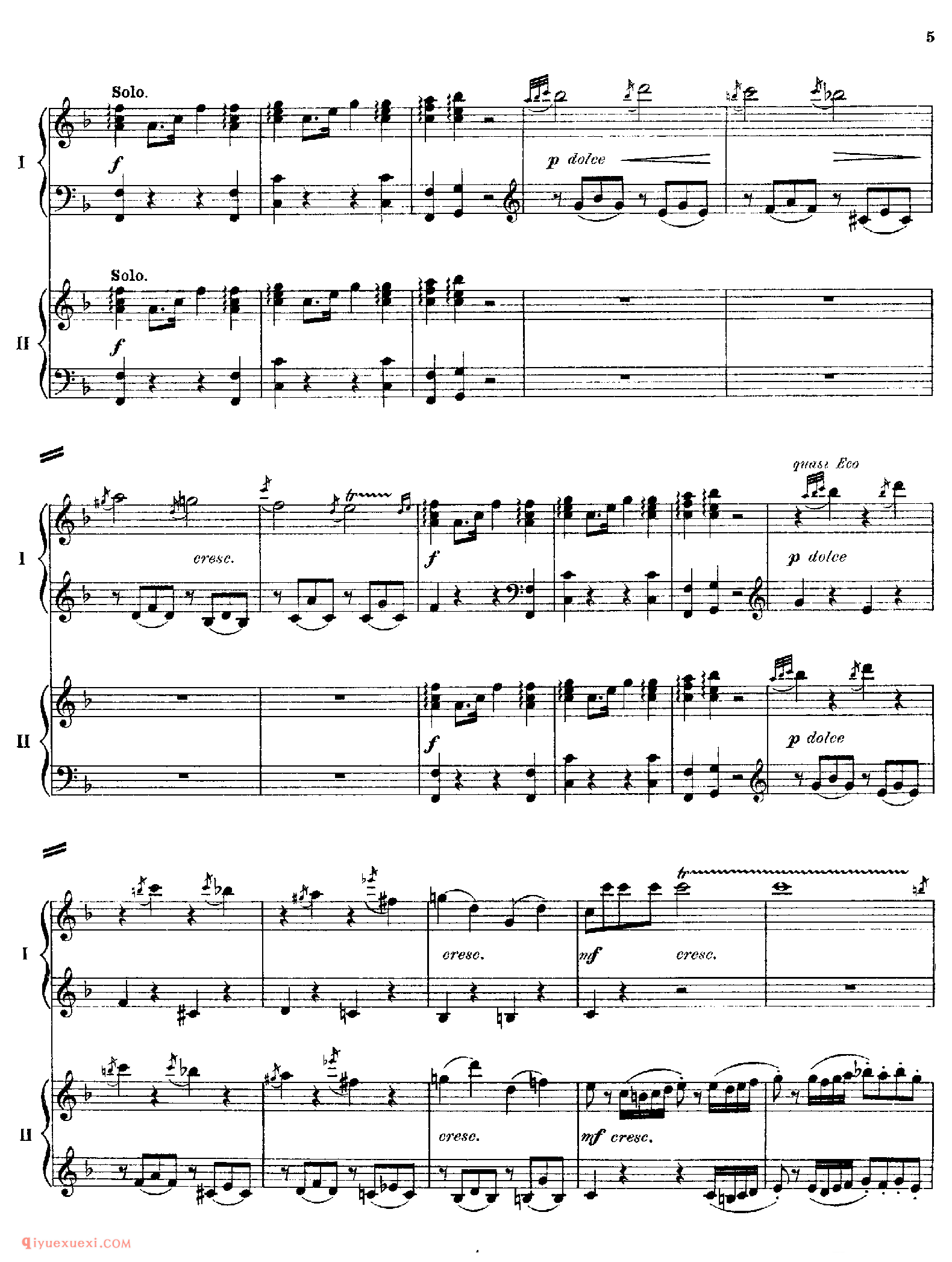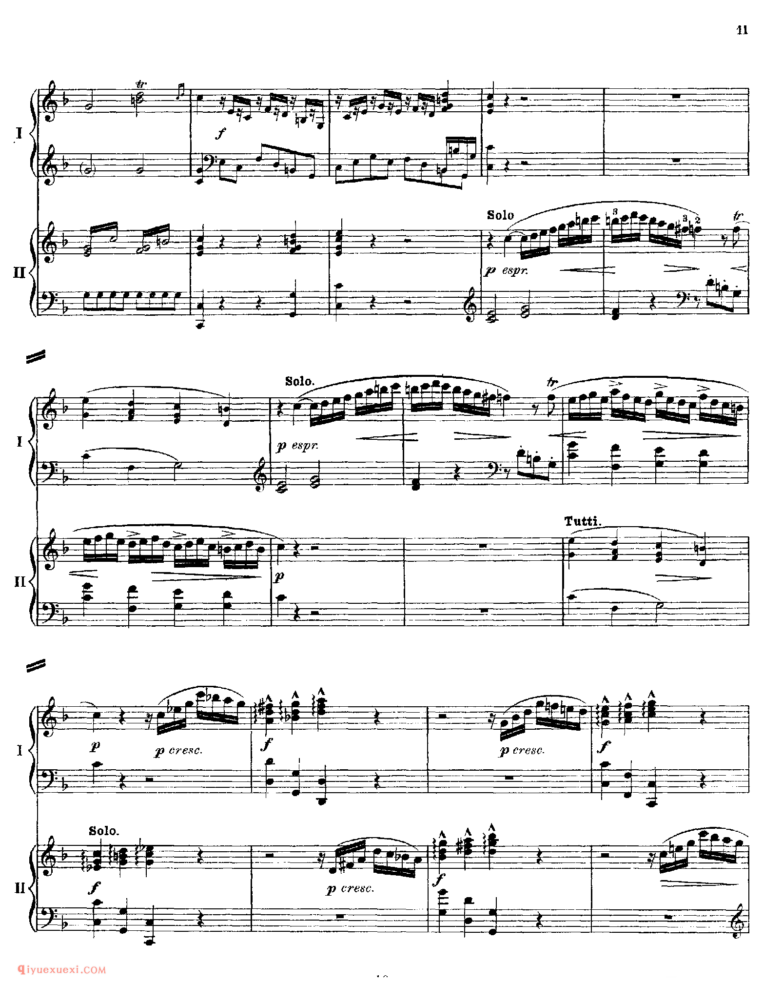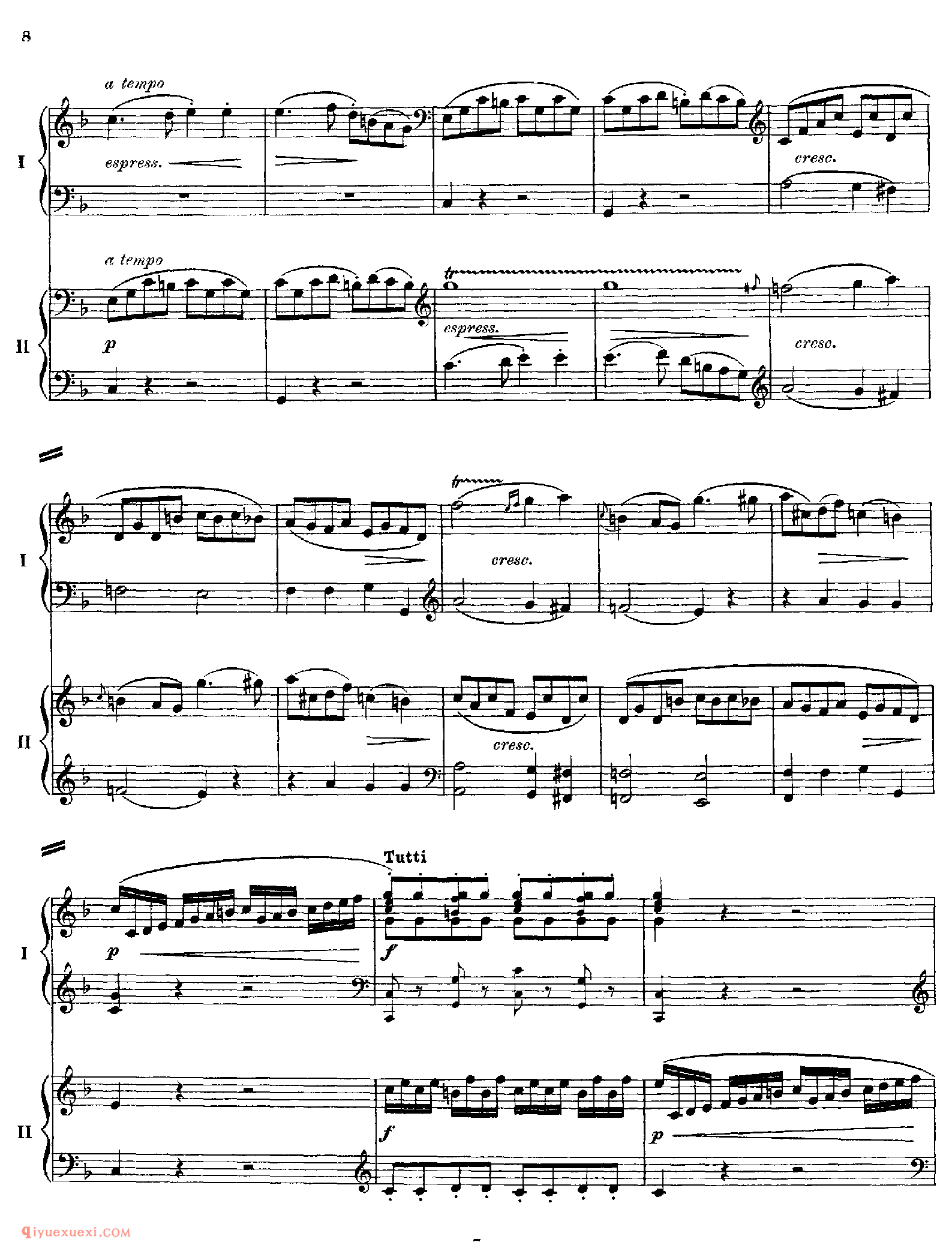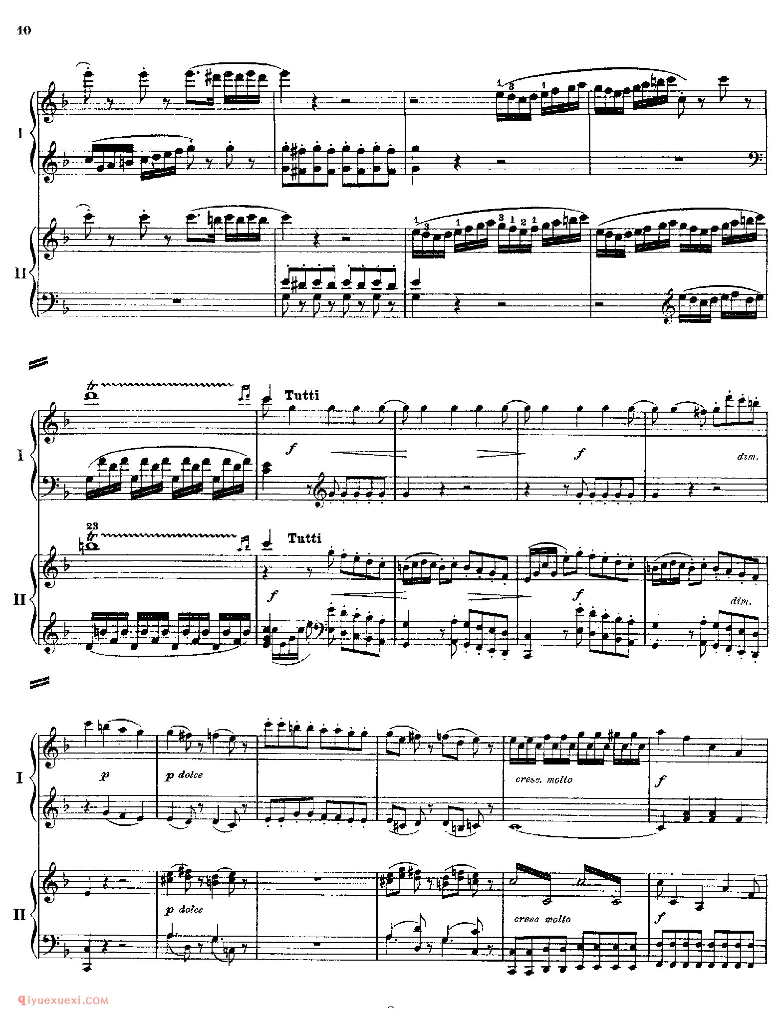 3.小步舞曲,F大调,A-B-A-C-A-B-A的大回旋曲式。小步舞曲性格的第一主题先由第一钢琴呈示,B段为c大调,C段为C小调,先由第二钢琴演奏。第三次上场的A段则插入降B大调新主题。