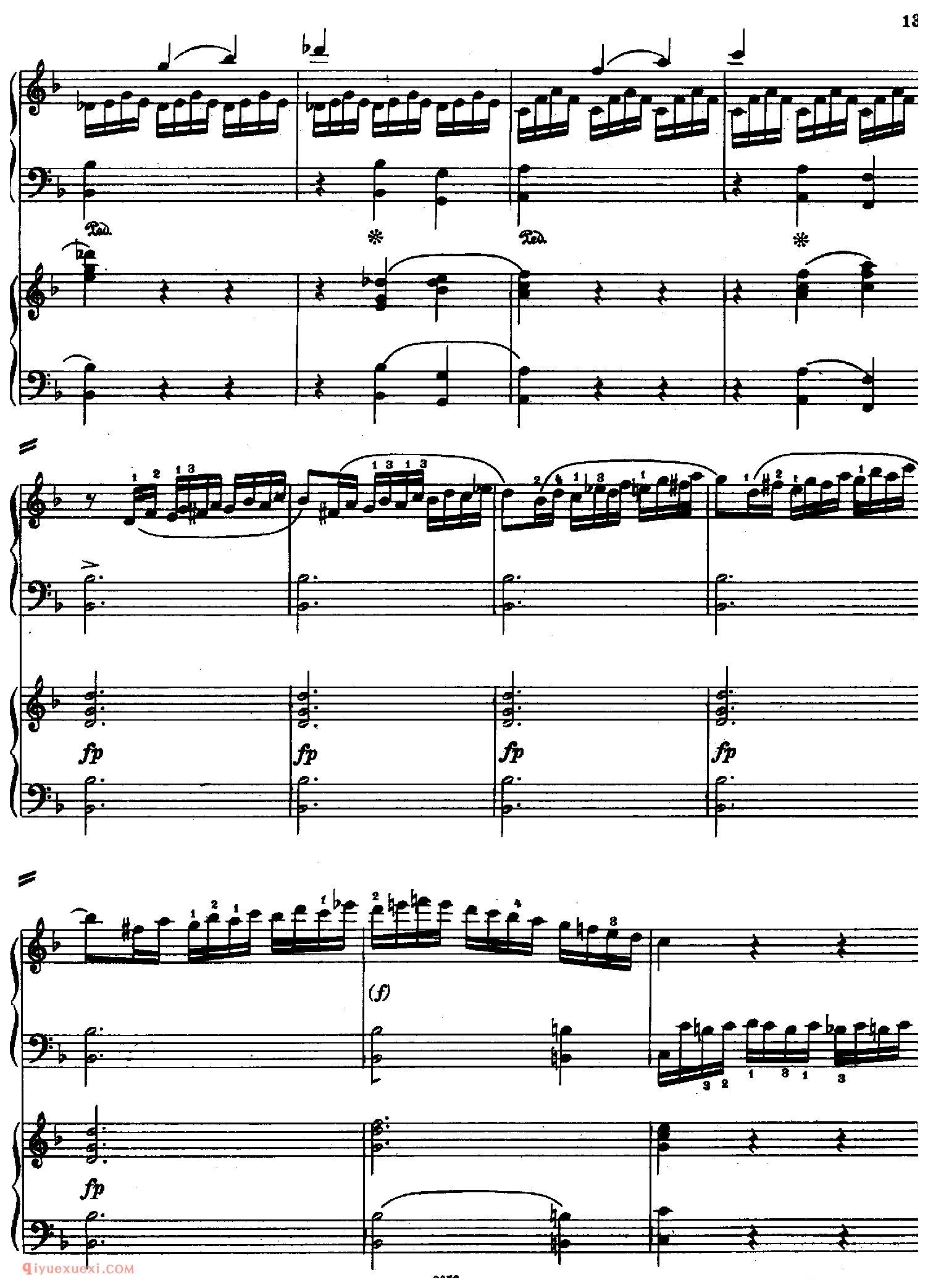 2.小广板,降B大调,始终以阿尔贝蒂低音(Alberti bass)伴奏的主题,形式为含乐队序奏的二段体。以主奏钢琴为主体的主部,由主题及含调性膨胀的反复和新插入句等一系列反复两次,然后以简单的尾奏结尾。
