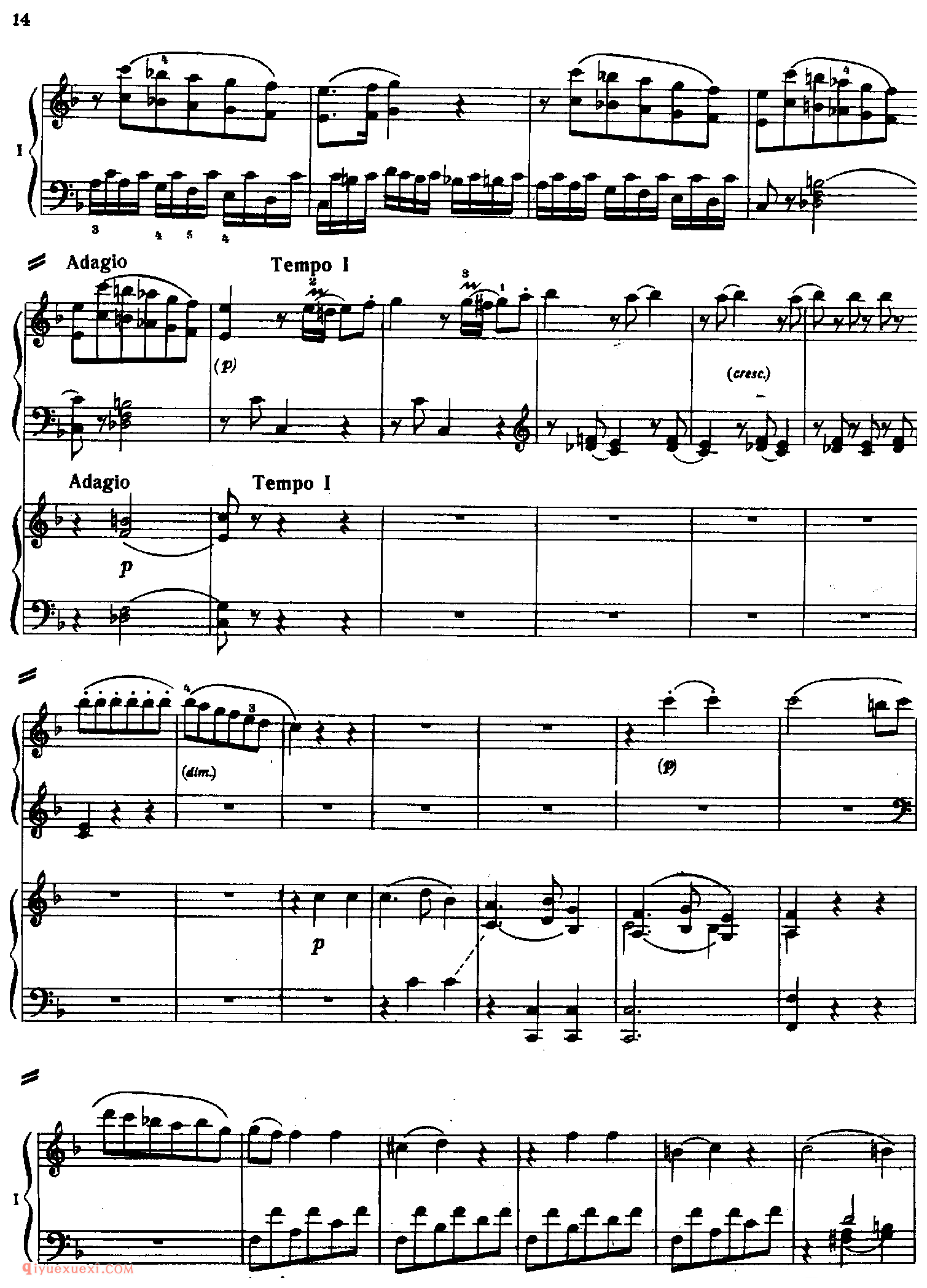 3.小步舞曲速度,F大调,回旋曲式。开头以乐队奏32小节回旋曲主题为小步舞曲形态。乐队之后主奏把主题单纯地变奏。主题的前后半段分别被主奏钢琴、乐队或弦乐队以变化反复。回旋曲和第二段以高四度反复新要素而转成降B大调,非常优美。第三段达成尾奏效果,主题在最后作各种各样变奏,弦乐奏主题,钢琴以四度音程及辉煌的音阶回应,强有力的合奏推向高潮,圆号再奏主题,钢琴回应,双簧管再回应,构成美丽的回声。