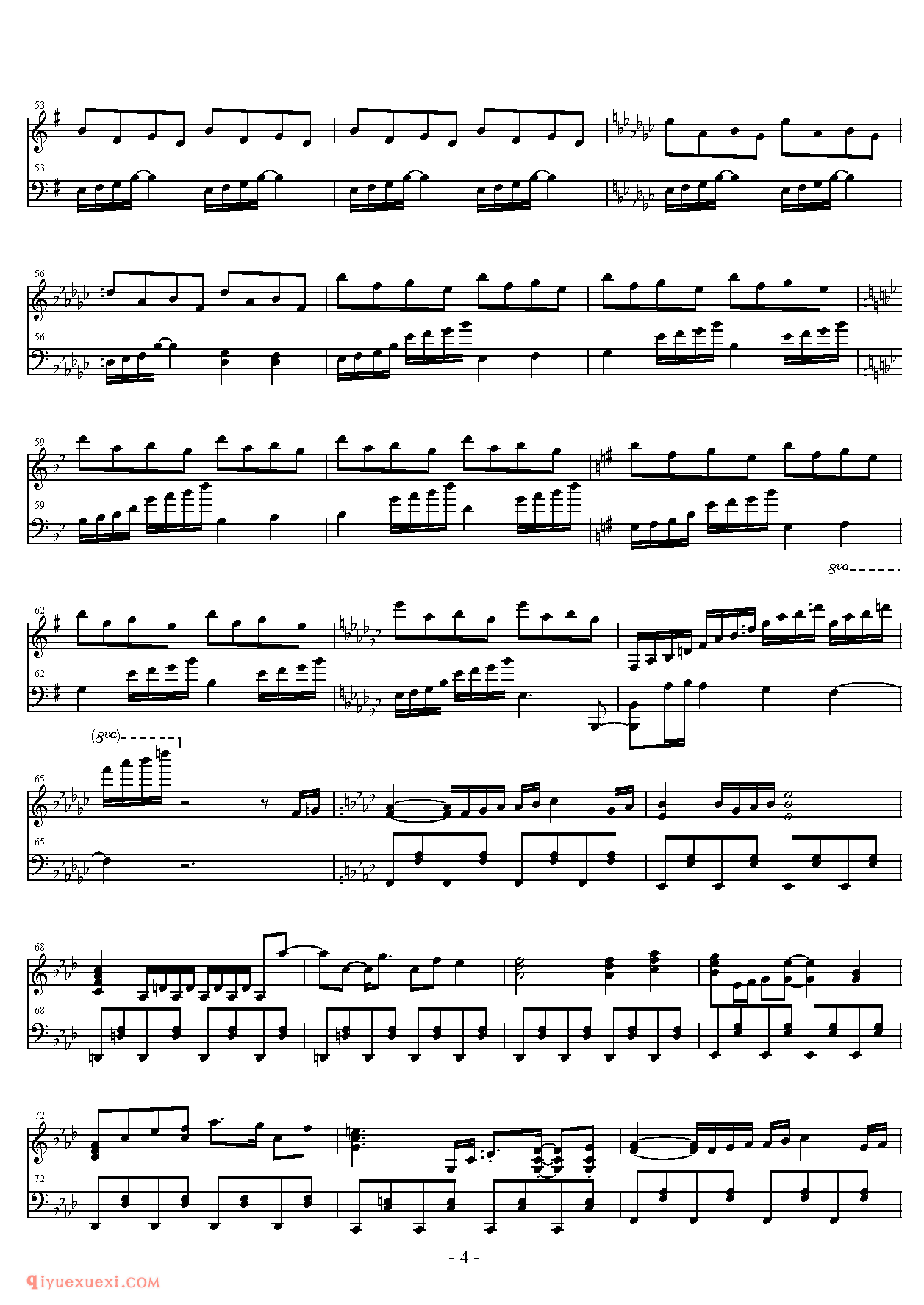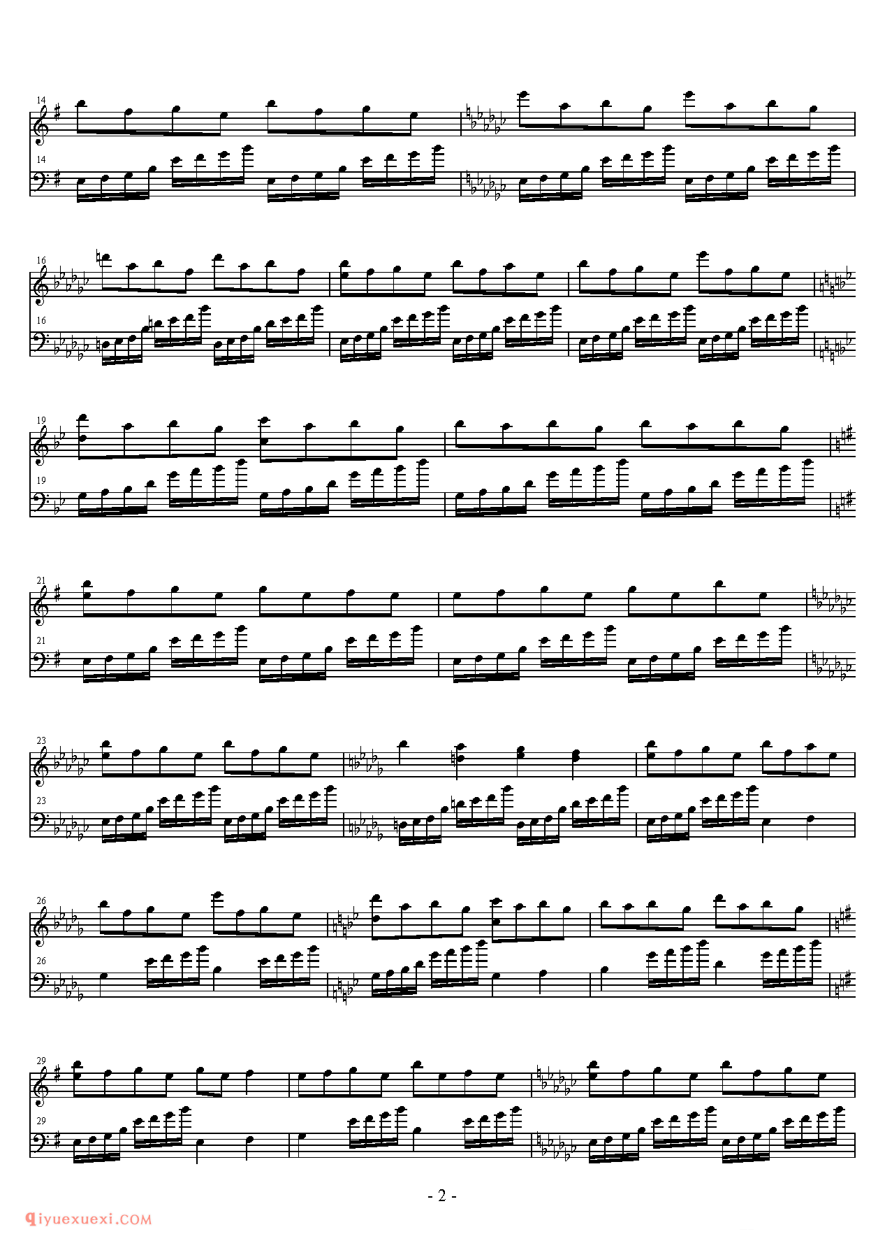 技巧: 1.这首作品和前面第八条的训练内容是一样的,都是音阶型的跑动练习,所不同的是这条练习曲以左手训练为主,左手需要注意的技巧要点和右手一样,仍然是换指动作的准确性。(具...