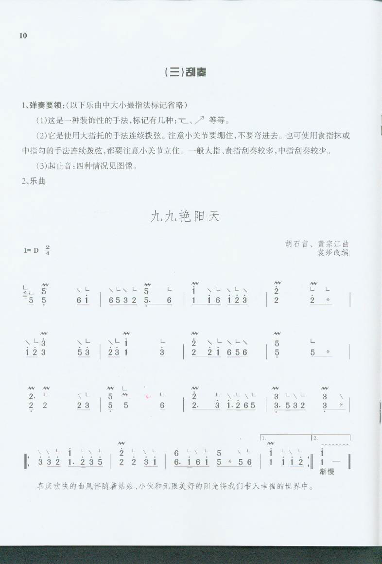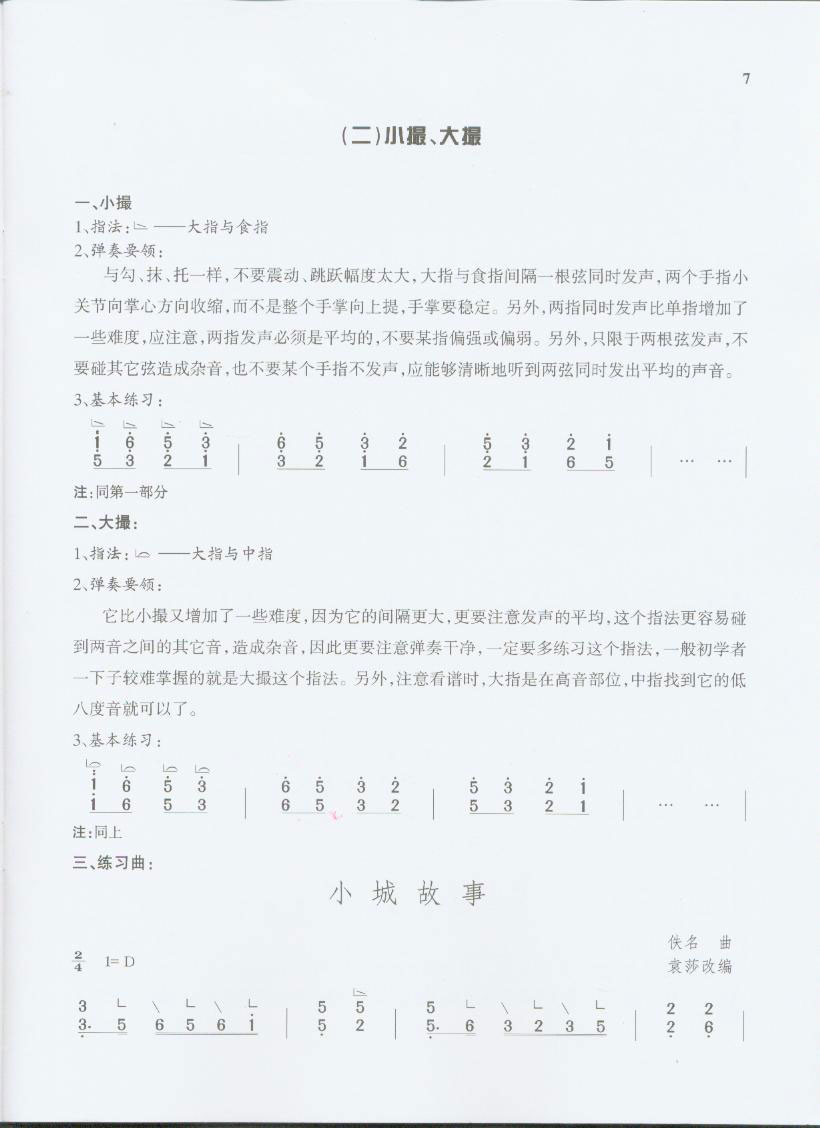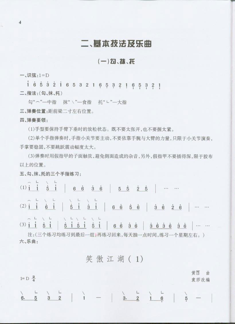 (3)弹奏时用假指甲的子面触弦,避免侧面造成的杂音,另外,假指甲不要插得深,限于胶布以上的位置。