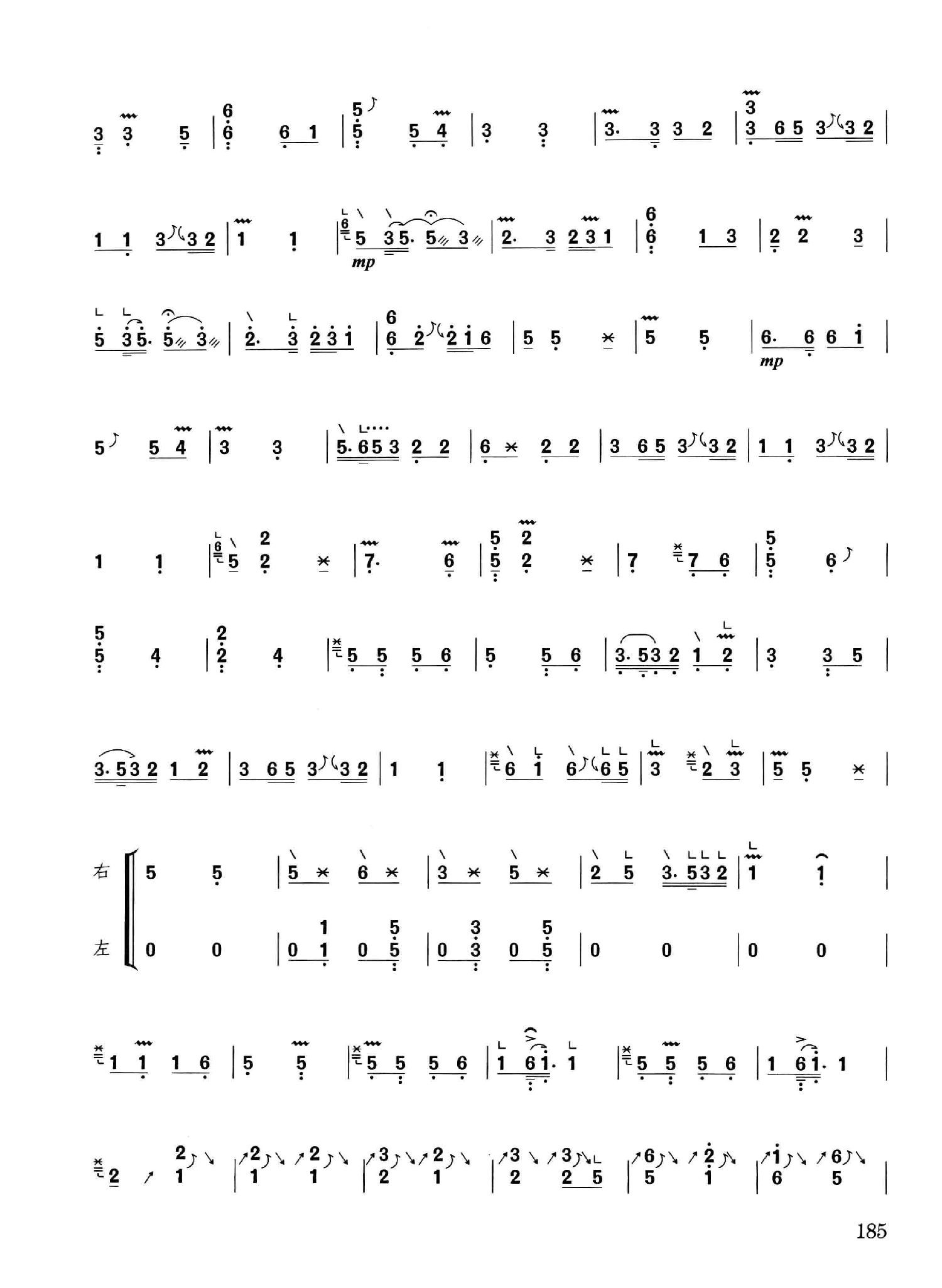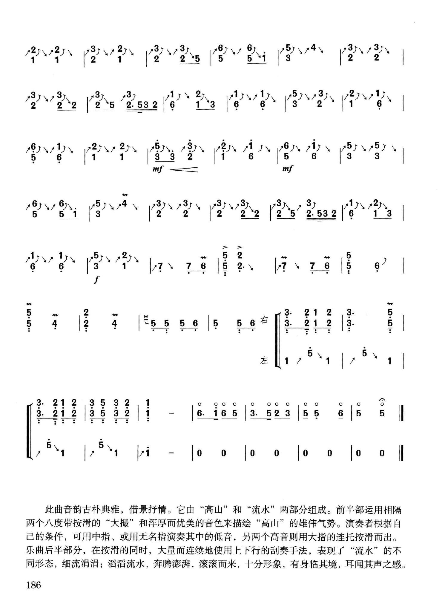 此曲音韵古朴典雅,借景抒情。它田高山业撒A八山”的雄伟气势。演奏者根据自两个八度带按滑的“大撮”和浑厚而优主内的巴充类两个高音则用大指的连托按滑而出。己的条件,可用中指、或用无名指演奏其中的低音,另两个高音则用大指的连托按滑。乐曲后半部分,在按滑的同时,大量而连续地使用上下行的刮奏手法,表现了“流水”的不同形态,细流泪涓;滔滔流水,奔腾澎湃,滚滚而来,十分形象,有身临其境,耳闻其声之感。