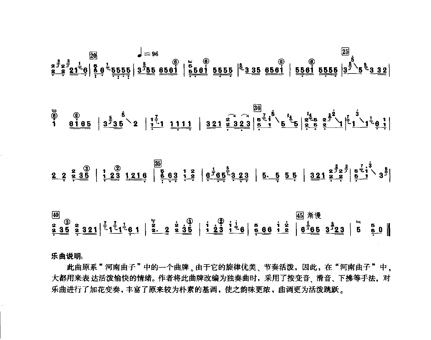 此曲原系“河南曲子”中的一个曲牌。由于它的旋律优美、节奏活泼,因此,在“河南曲子”中,大都用来表达活泼愉快的情绪。作者将此曲牌改编为独奏曲时,采用了按变音、滑音、下拂等手法,对乐曲进行了加花变奏,丰富了原来较为朴素的基调,使之韵味更浓,曲调更为活泼跳跃。