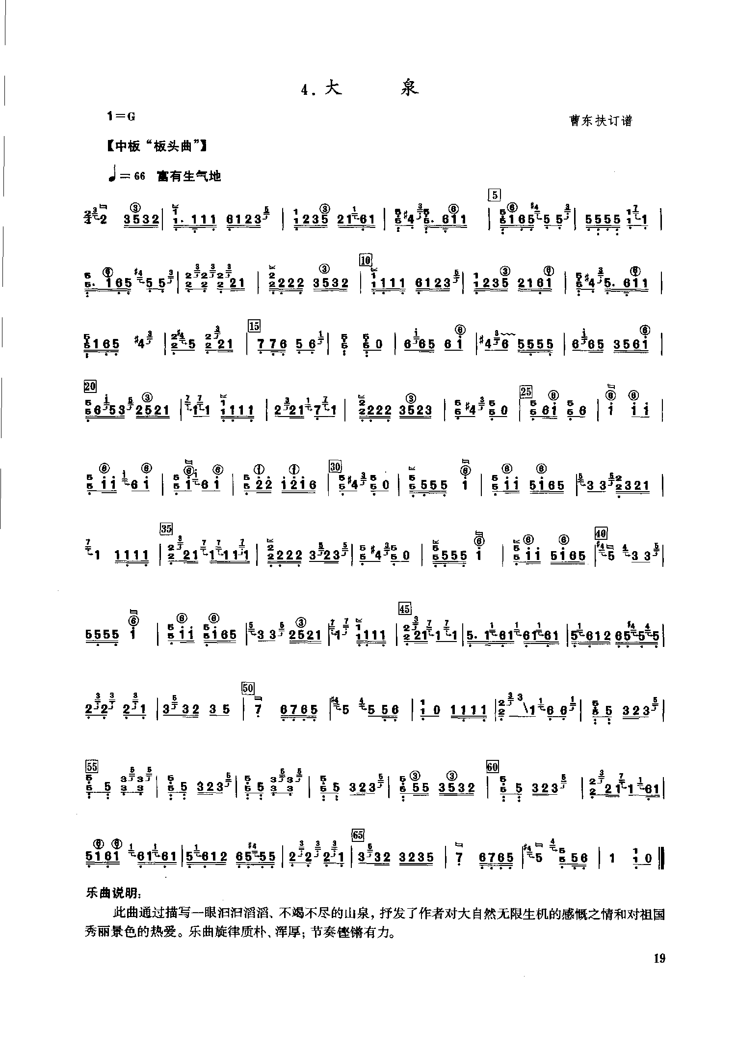 此曲通过描写--眼汩汩滔滔、不竭不尽的山泉,抒发了作者对大自然无限生机的感慨之情和对祖国秀丽景色的热爱。乐曲旋律质朴、浑厚;节奏铿锵有力。