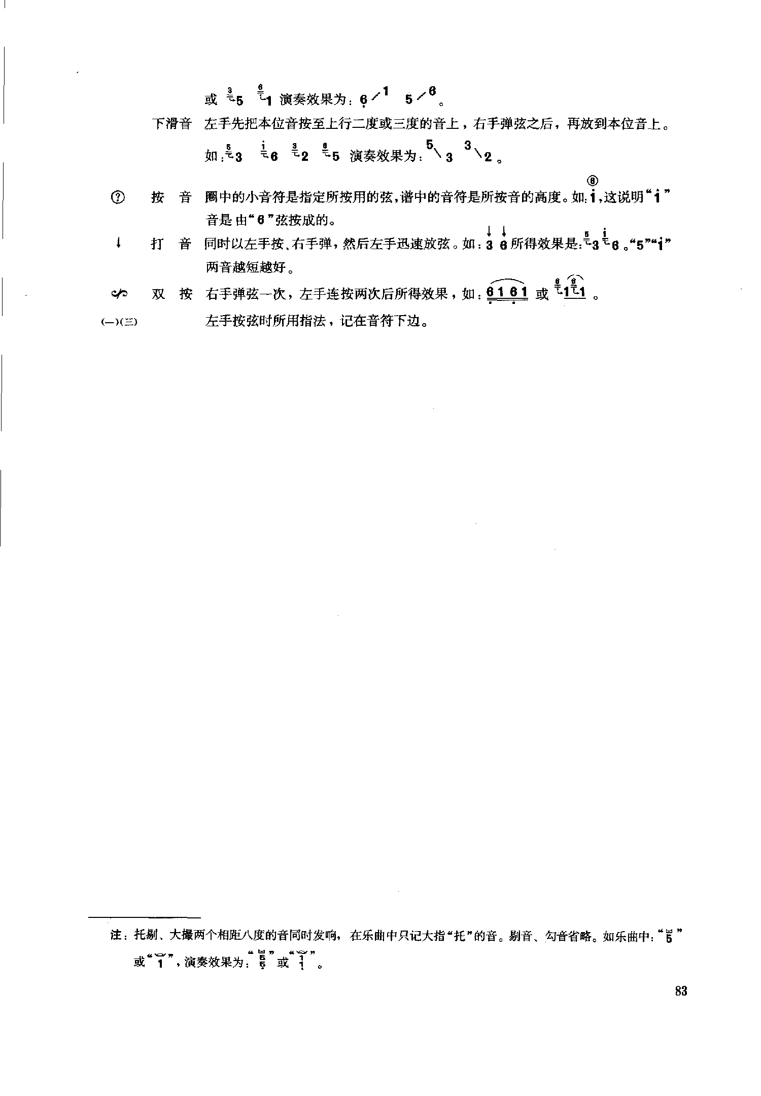 双托将低—弦按升与原弦成同度,大指同时“托”出两音并同时发响。双抹将低--弦按升与原弦成同度,食指向内同时弹两个高低相等的音。双挑将低----弦按升与原弦成同度,食指向外同时弹两个高低相等的音。托剔大指托,中指剔,两个相距八度的音同时发响。