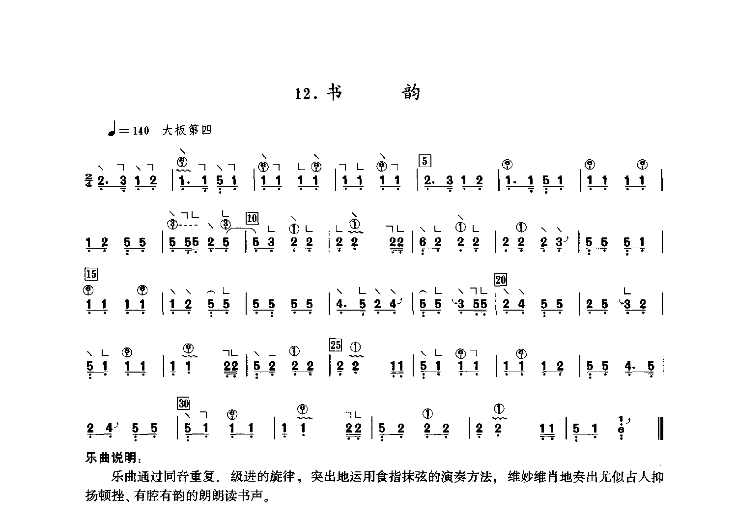 乐曲说明:乐曲通过同音重复、级进的旋律,突出地运用食指抹弦的演奏方法,维妙维肖地奏出尤似古人抑扬顿挫,有腔有韵的朗朗读书声。