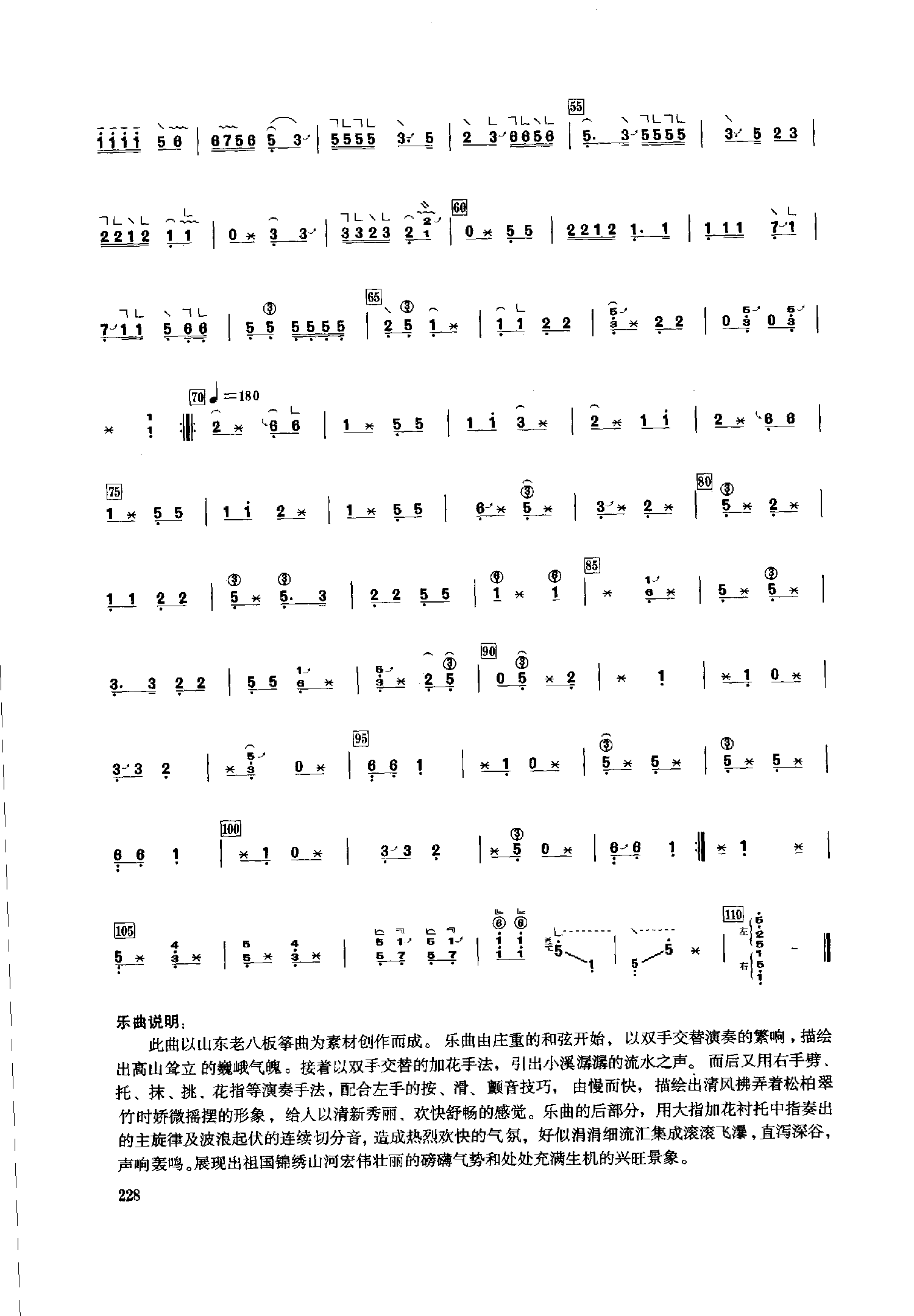 此曲以山东老八板筝曲为素材创作而成。乐曲由庄重的和弦开始,以双手交替演奏的繁响﹐描绘出高山耸立的巍峨气魄。接着以双手交替的加花手法,引出小溪潺潺的流水之声。而后又用右手劈、托、抹、挑、花指等演奏手法,配合左手的按、滑、颤音技巧,由慢而快,描绘出清风拂弄着松柏翠竹时娇微摇摆的形象,给人以清新秀丽、欢快舒畅的感觉。乐曲的后部分,用大指加花衬托中指奏出的主旋律及波浪起伏的连续切分音,造成热烈欢快的气氛,好似涓涓细流汇集成滚滚飞瀑,直泻深谷,声响轰鸣。展现出祖国锦绣山河宏伟壮丽的磅礴气势和处处充满生机的兴旺景象。