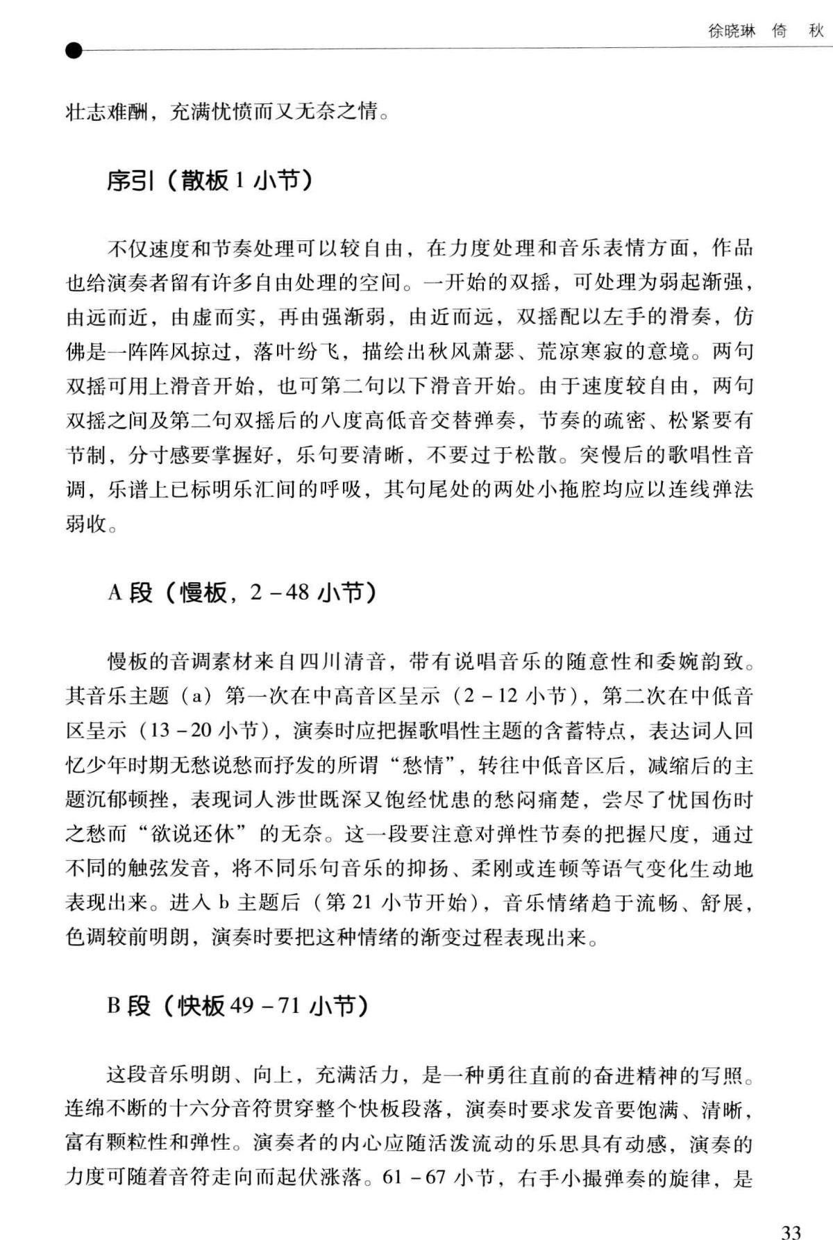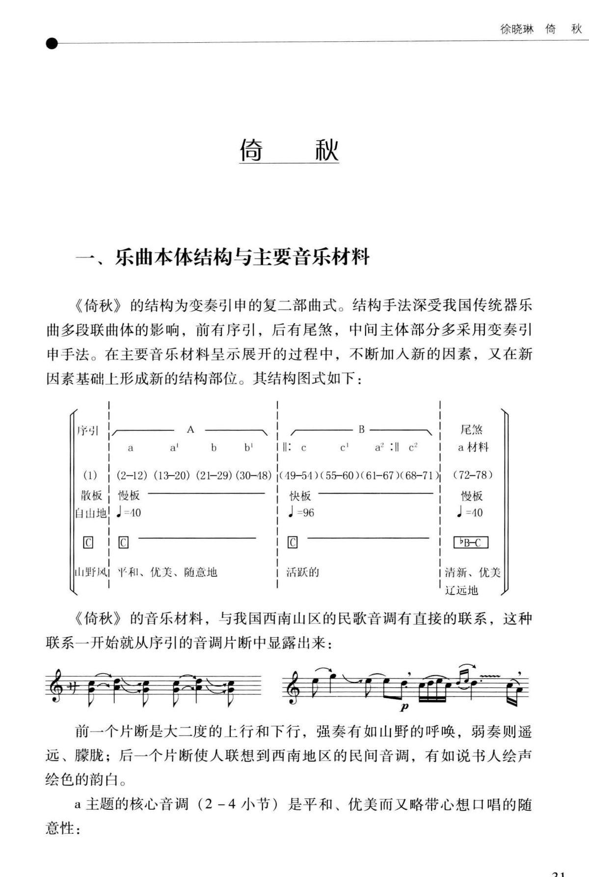《倚秋》的结构为变奏引申的复二部曲式。结构手法深受我国传统器乐曲多段联曲体的影响,前有序引,后有尾煞,中间主体部分多采用变奏引申手法。在主要音乐材料呈示展开的过程中,不断加入新的因素,又在新因素基础上形成新的结构部位。