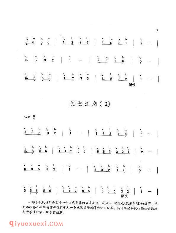 筝的难度跨度是非常大的。对于专业演奏来讲,要达到一定的程度,是非常不容易的。然而筝又有着好听易学的特点,对于初学者来说,它又能很快的掌握--些基本技巧,来演奏一些简单又好听的乐曲。今天我就是针对广大古筝初学者的要求,从古筝最基础的知识讲起,并结合一些烩炙人口的歌曲曲调,使大家可以兴致盎然的学习古筝。并且能在短短几个月的时间里学会弹奏自己喜爱的歌曲,和一些古筝传统经典曲目。经典的也一定是代表性的,是在时间的过滤下留存的精华与典形。