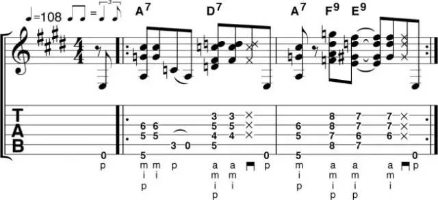 说到布鲁斯音乐,就不得不提属七和弦(例如A7或D7)。本文中展示的A7、D7和E9和弦在A调的12小节布鲁斯中是非常关键的3个和弦。
