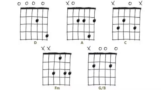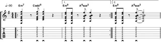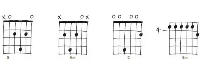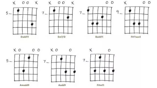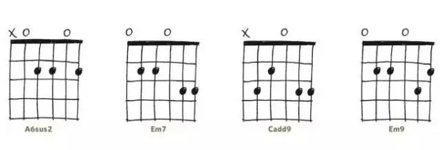 初学吉他时我们最先接触的就是简单的开放和弦,例如C、A、G、Em等。 但你早已厌倦谁都能弹两下的这几个和弦了吧?这里的四个和弦都是好按的开放和弦,同时听上去又更新鲜。Em7和Cadd9算是比较常用的,Em9和A6sus2则少见一些,听上去都比较清爽。