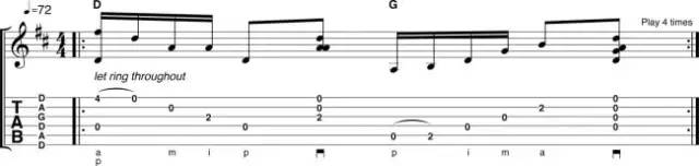 示例中第一、二小节的手型可以在指板上上下移动,几乎在任何的位置都很好听,如果你在这种调弦法中只能学一种和弦,那就是它没错啦。
