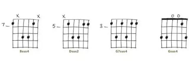 挂留和弦在大和弦与小和弦的前后演奏都非常合适,因为他们共享同样的根音,比方说Bsus4转B, or Asus4转A等等,你可以在基本的大和弦和小和弦中去切换挂留和弦,感受一下它的特点。
