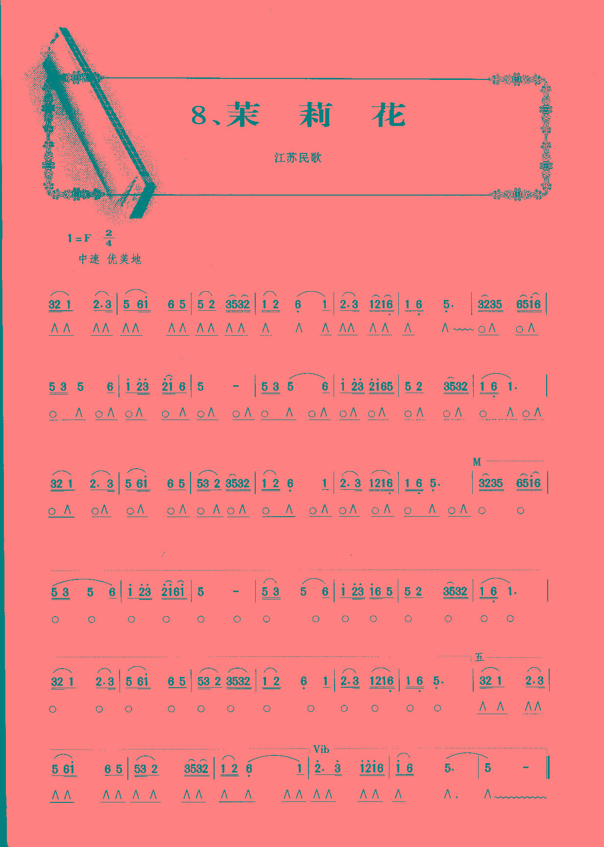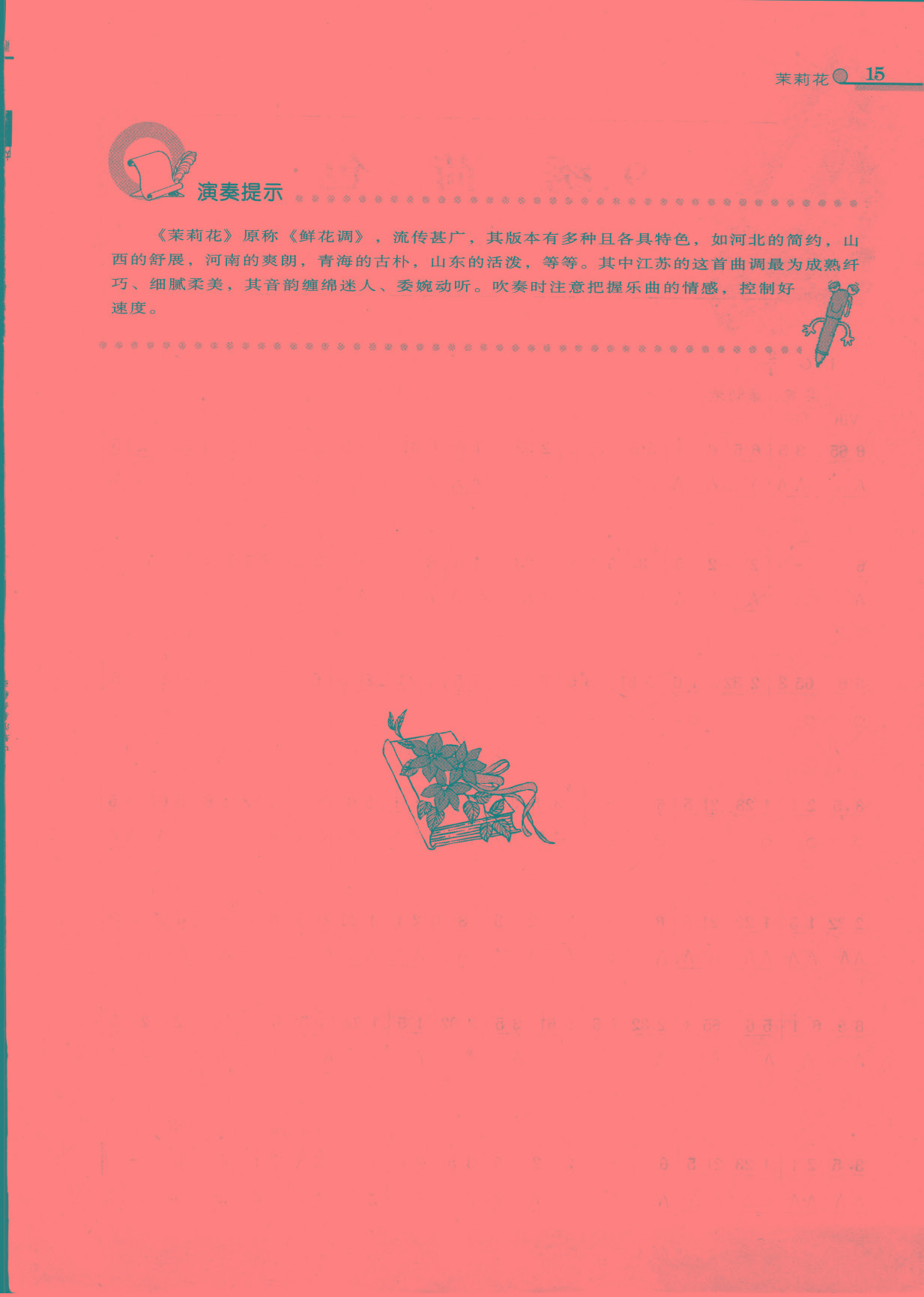 《茉莉花》原称《鲜花调》,流传甚广,其版本有多种且各具特色,如河北的简约,山西的舒展,河南的爽朗,青海的古朴,山东的活泼,等等。其中江苏的这首曲调最为成熟纤巧、细腻柔美,其音韵缠绵迷人、委婉动听。吹奏时注意把握乐曲的情感,控制好速度。