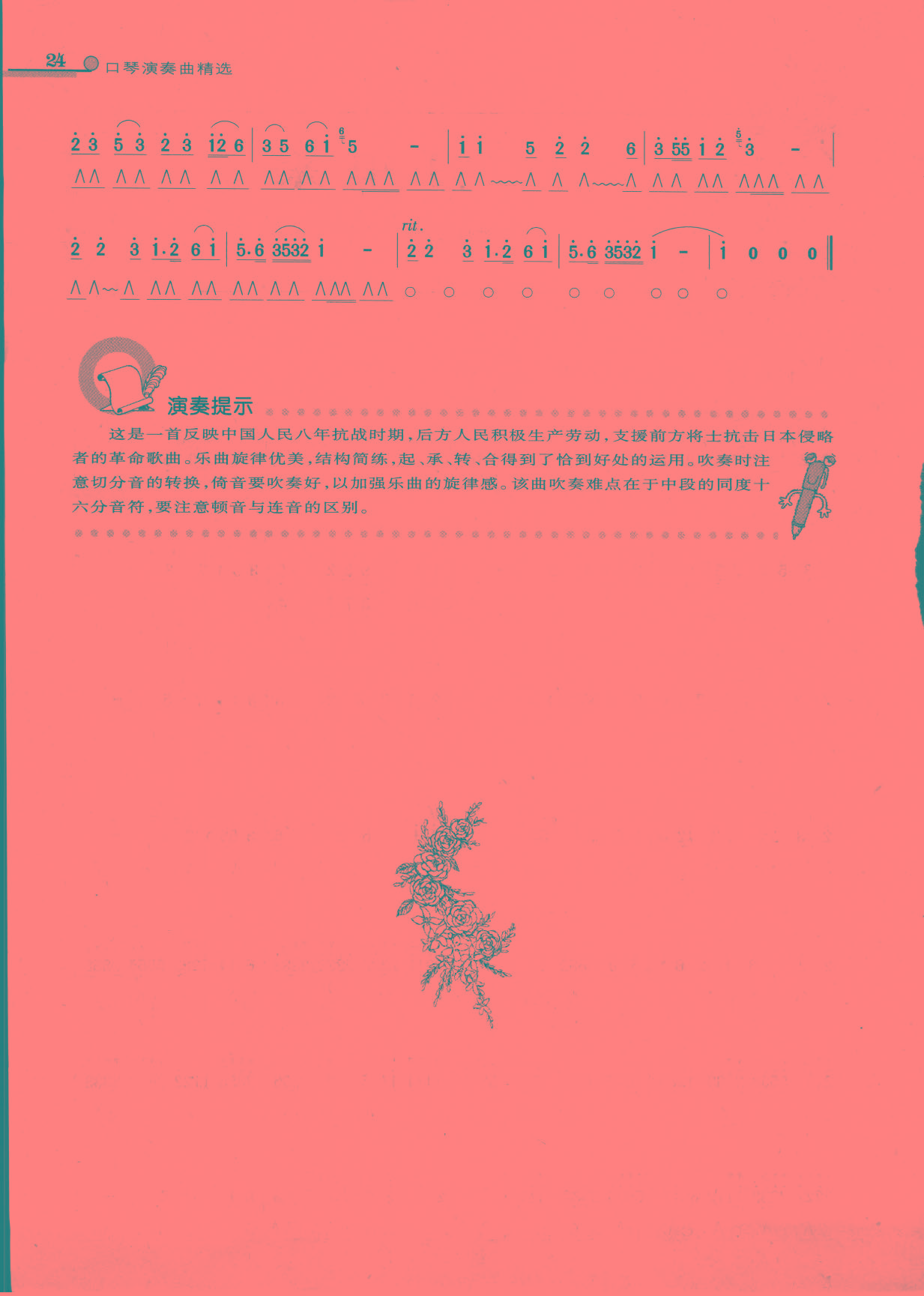 这是一首反映中国人民八年抗战时期,后方人民积极生产劳动,支前方将士抗击日本侵略者的革命歌曲。乐曲旋律优美,结构简练,起、承、转、合得到了恰到好处的运用。吹奏时注意切分音的转换,倚音要吹奏好,以加强乐曲的旋律感。该曲吹奏难点在于中段的同度十六分音符,要注意顿音与连音的区别。