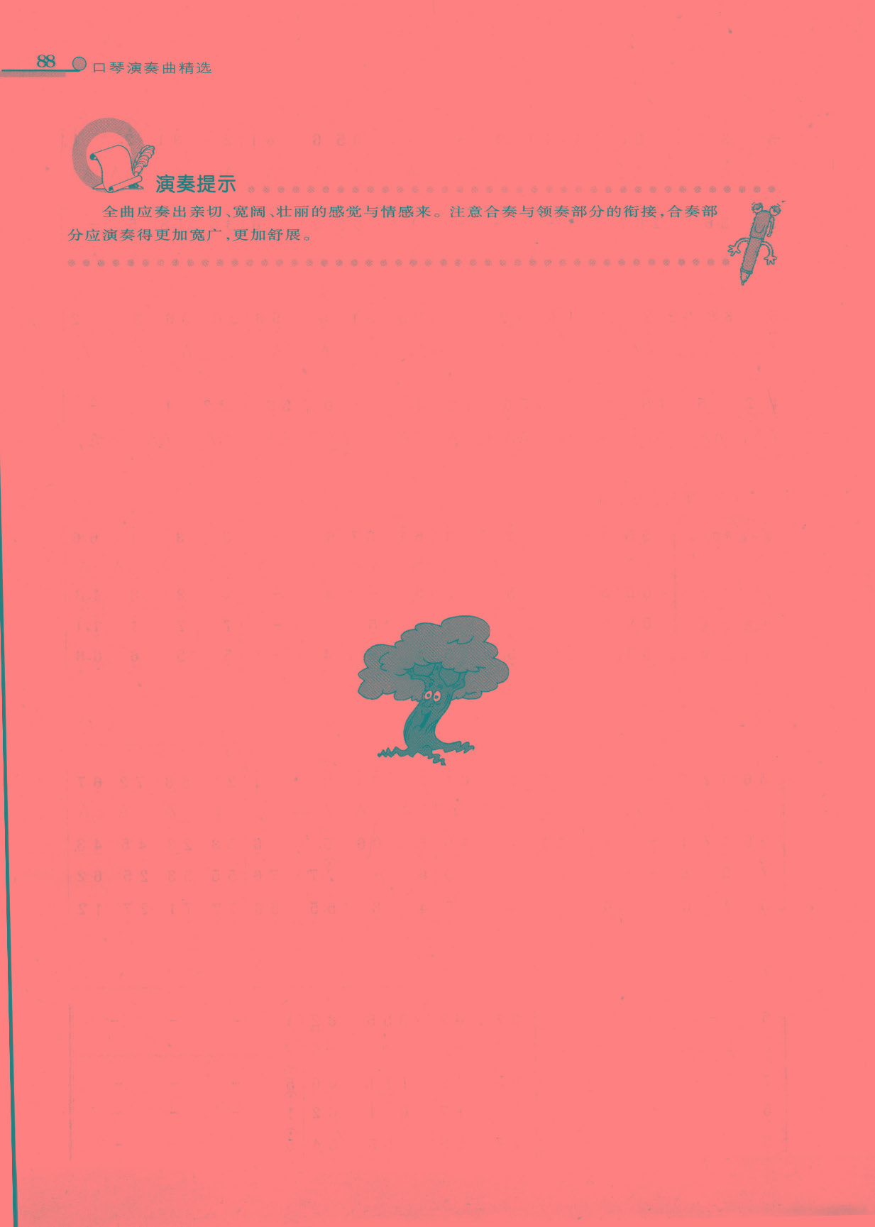 全曲应奏出亲切、宽阔、壮丽的感觉与情感来。注意合奏与领奏部分的衔接,合奏部分应演奏得更加宽广,更加舒展。