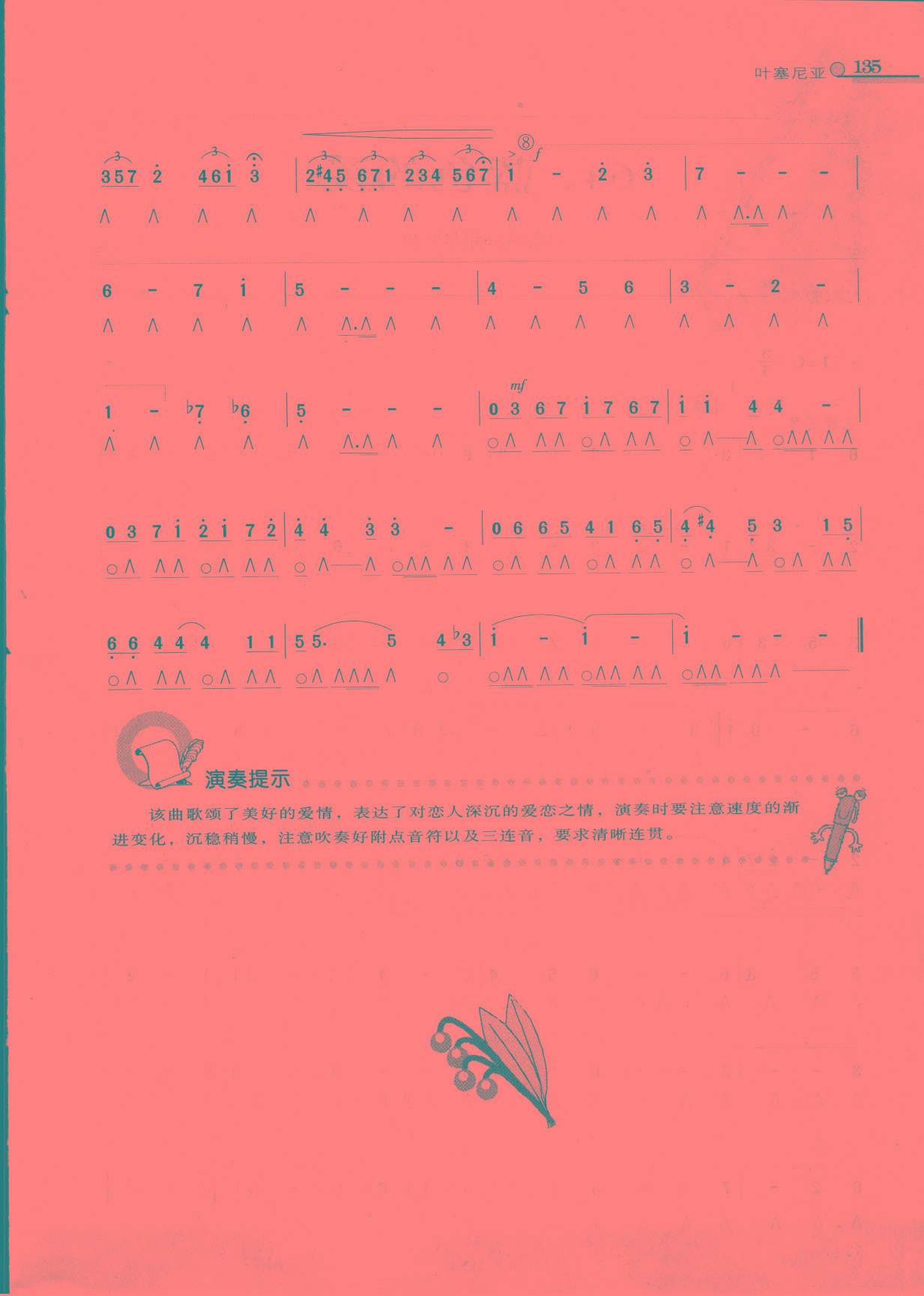 该曲歌颂了美好的爱情,表达了对恋人深沉的爱恋之情,演奏时要注意速度的渐进变化,沉稳稍慢,注意吹奏好附点音符以及三连音,要求清晰连贯。