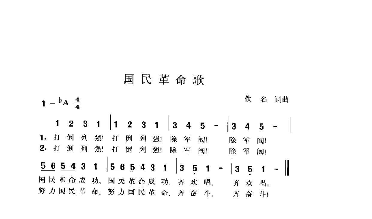 国民革命歌 侠名词曲高清简谱歌词是器乐学习网于2025年01月12日 13:33:02更新分享的歌曲简谱;资源收录于歌曲简谱栏目中;器乐学习网免费分享国民革命歌 侠名词曲简谱与五线谱歌谱图片,欢迎在线免费下载;器乐学习网无需注册会员,直接免费下载各类乐器学习资源及乐谱。