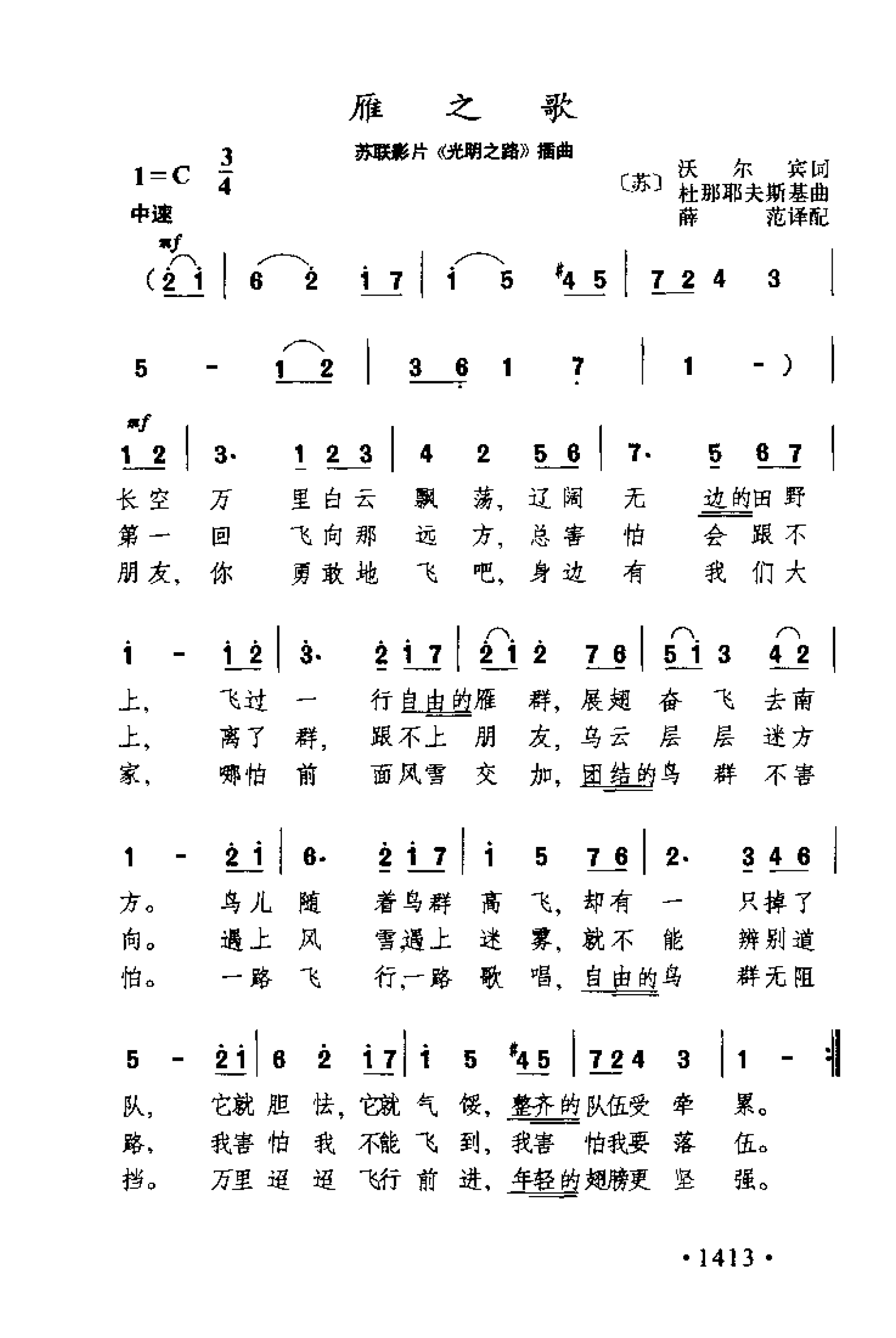雁之歌(苏联影片《光明之路》插曲)(苏)杜那耶夫斯基曲高清简谱歌词是器乐学习网于2025年02月08日 20:18:56更新分享的歌曲简谱;资源收录于歌曲简谱栏目中;器乐学习网免费分享雁之歌(苏联影片《光明之路》插曲)(苏)杜那耶夫斯基曲简谱与五线谱歌谱图片,欢迎在线免费下载;器乐学习网无需注册会员,直接免费下载各类乐器学习资源及乐谱。