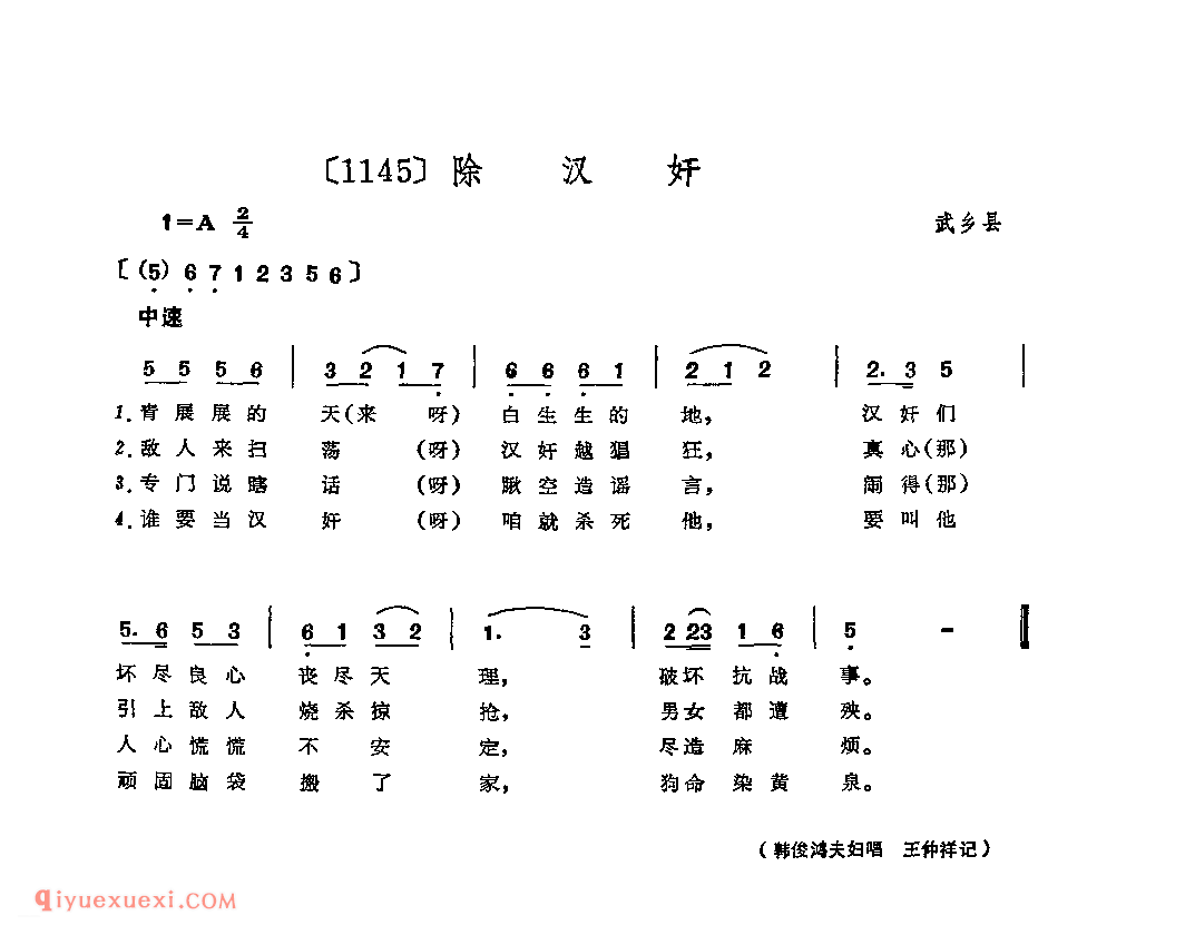 铲除汉奸&武乡县_小调类_山西民间歌曲简谱