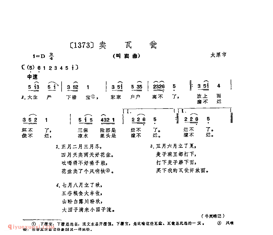 卖瓦瓮&太原市_小调类_山西民间歌曲简谱