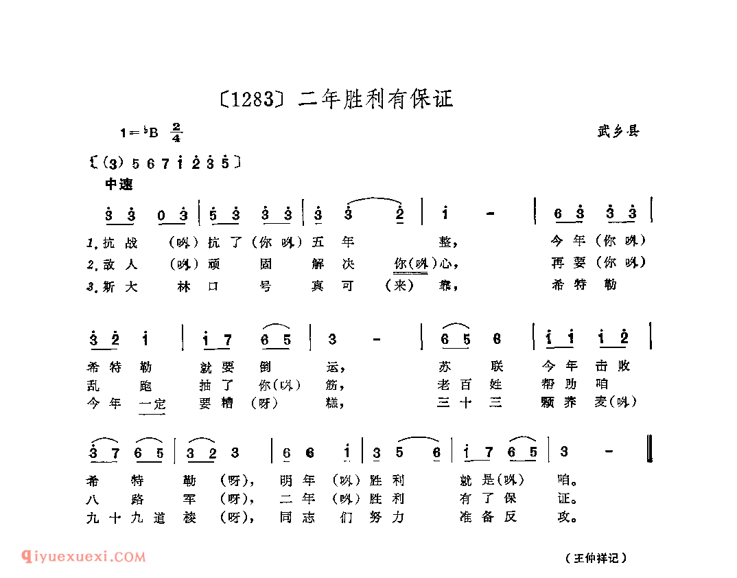二年胜利有保证&武乡县_小调类_山西民间歌曲简谱