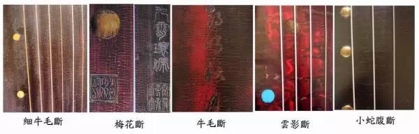 古人说:“古琴以断纹为证,不历数百年不断。”较常见的有蛇腹断、梅花断、牛毛断、龙纹断、龟纹断、冰裂断等。应该说,断纹是古琴之历史感与苍古美的最直接的视觉表征。