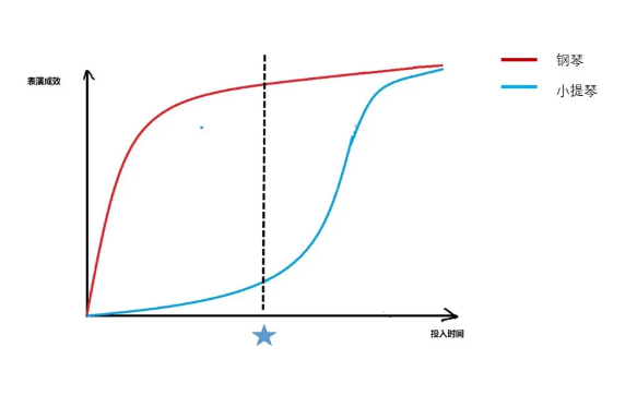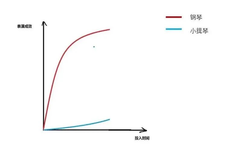 但小提琴却不是这样的。下面这张图,就是学习小提琴和钢琴的时间与演出效果的对比。