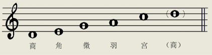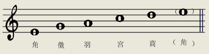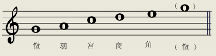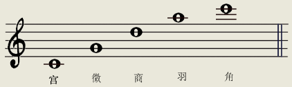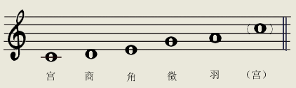 将这五个音移在一个八度内,它们名称的顺序是:宫、商、角、徴、羽。