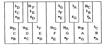 在前面我们讲到基本音级和变化音级时,所用的各个音级名称的键盘图表中,就可以看到,在一个琴键上就有两到三个音名,这两个或三个音名之间就互为等音。
