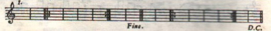如果乐曲有三部分组成,且第三部分是第一部分的重复,那么可以不抄写第一部分,而在第二部分结束处记写D.C.(从头反复),并在第一部分结束处记写Fine或“曲终”字样,表示乐曲的结束。如图:
